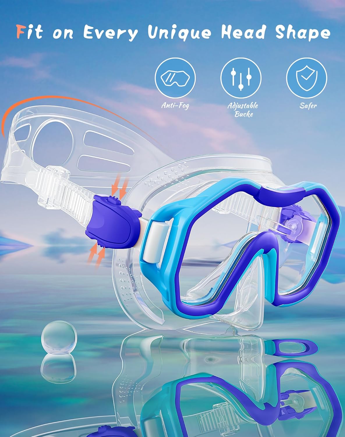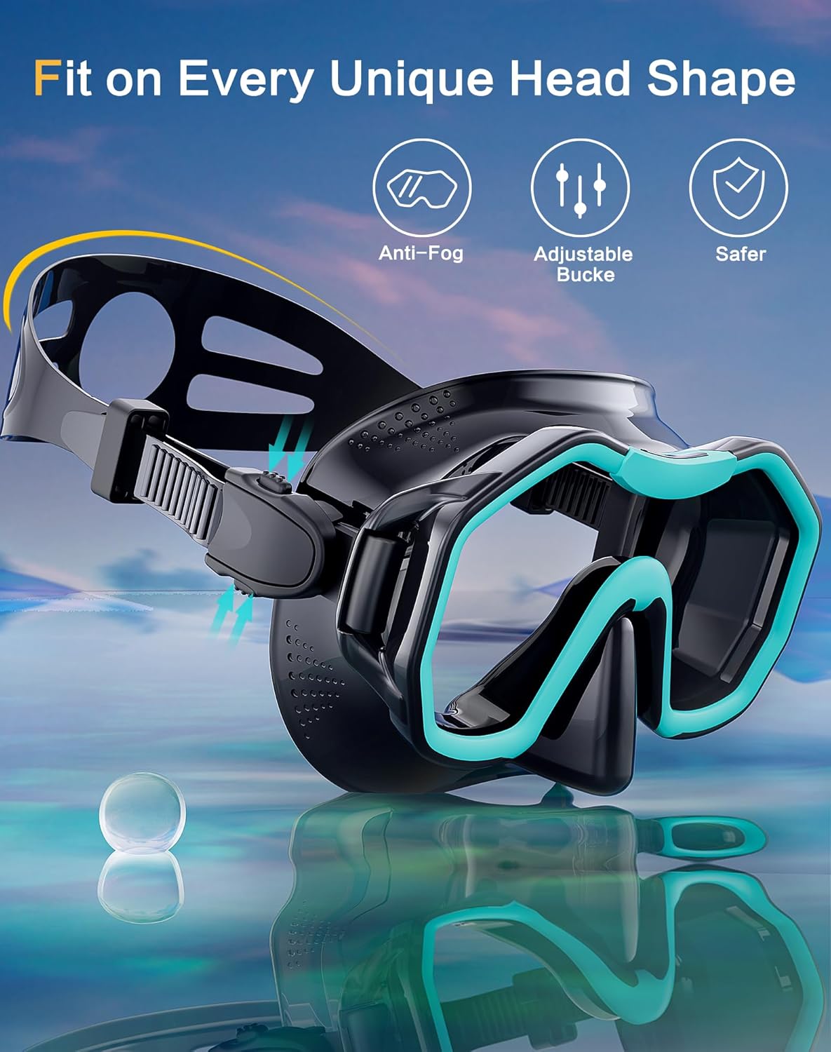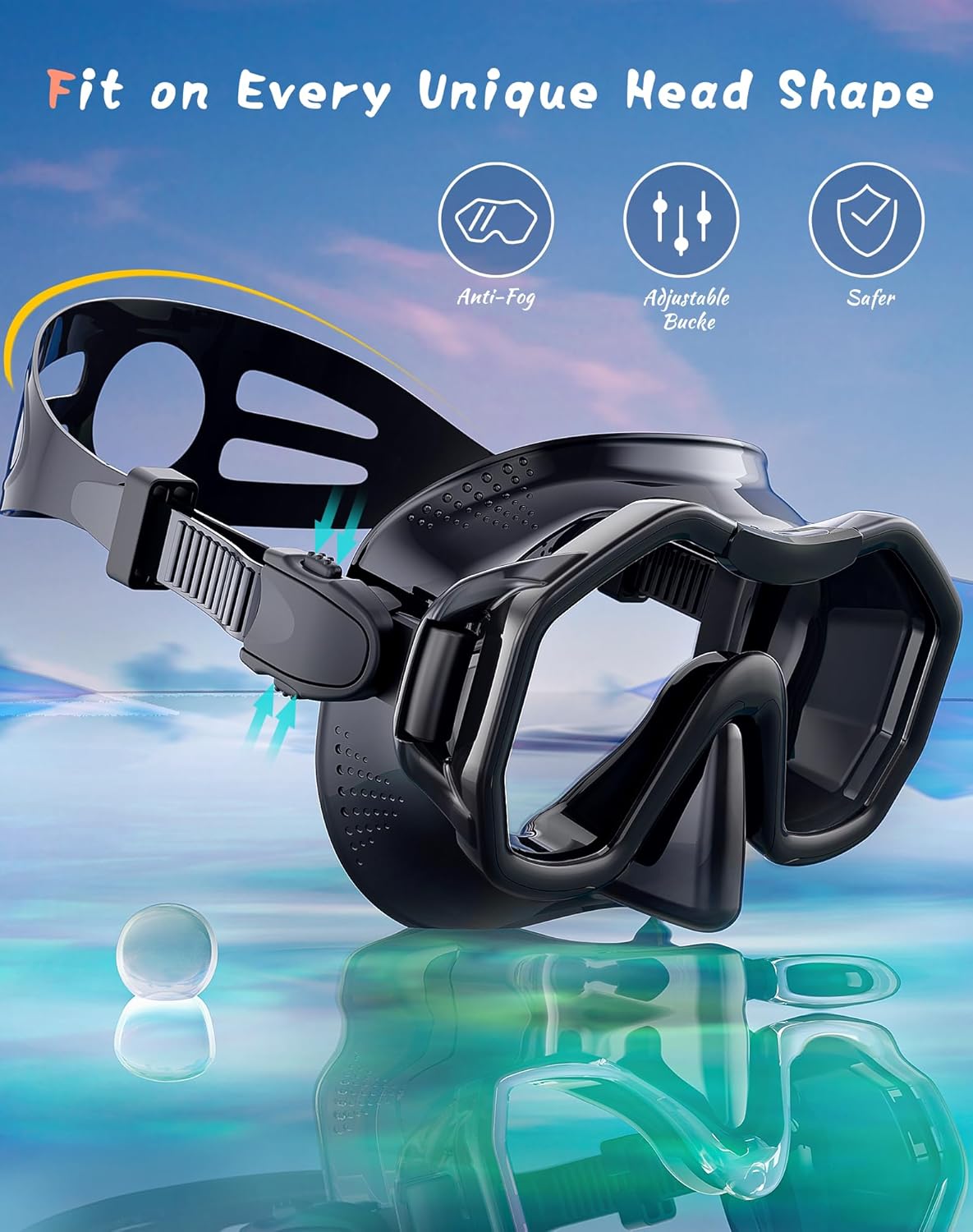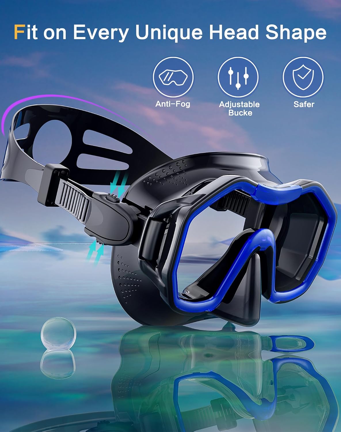 - ��Comfortable to Wear and Watertight��The diving mask is designed with soft ribbed silicon face seal mold technology. It fits most people's faces.The adjustable strap allows for a perfect fit to the face when worn. Watertight seal.
