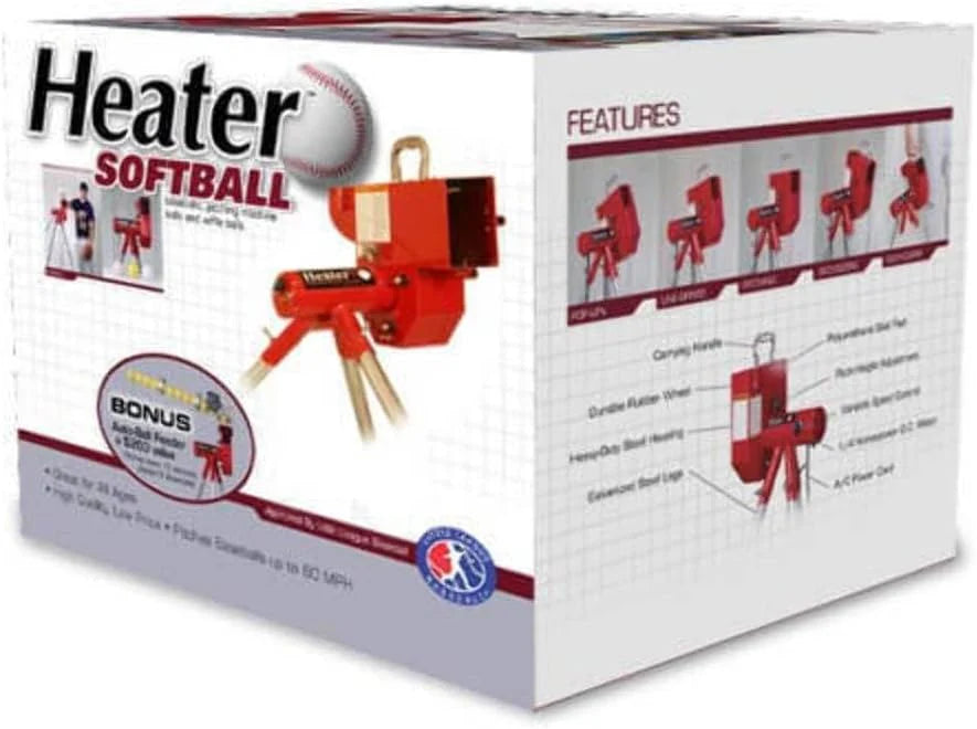 The Softball Pitching Machine with Bonus Ball Feeder from Heater Trend Sports is a terrific way to practice your softball hitting and fielding techniques. The powerful motor pitches 12-inch balls at up to 50 miles per hour! It features variable speed control and an automatic ball feeder that holds up to 9 softballs making it great for individual practice. Practice your fielding techniques by tilting the machine to prepare for catching grounders. line drives and pop-ups. This softball training aid features sturdy tubular steel legs with a fully adjustable pitch height. This Heater product uses standard A/C power. Improve your softball game today with the Heater Softball Pitching Machine and Bonus Ball Feeder.