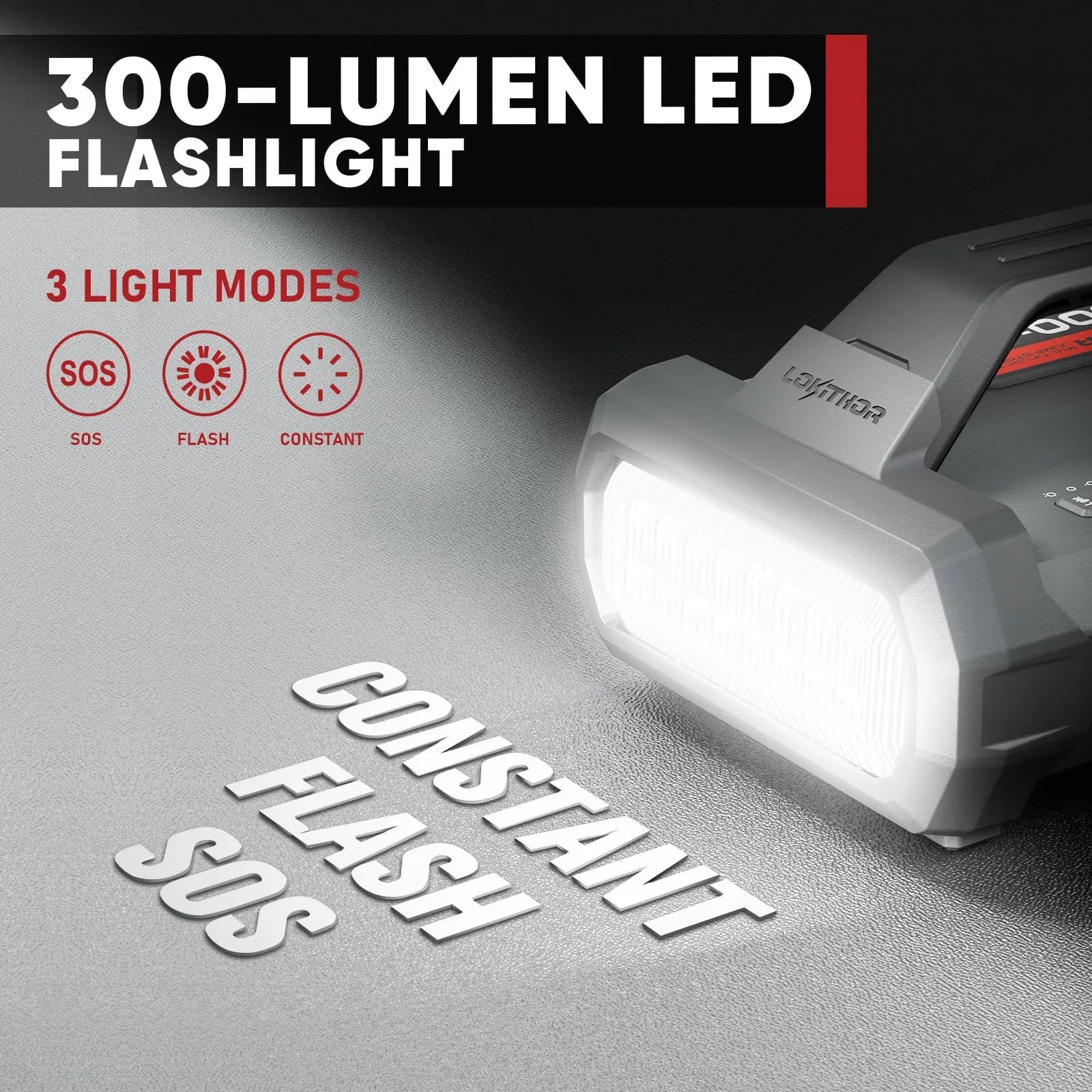 • 4-IN-1 Multi-Function - Not only a car battery booster. a Tire Pumper. but also a portable power bank. a LED flashlight. Support fast charging/USB 3.0. adapt smart phones. tablets and other USB devices. Input:5V/3A and 9V/2A. Output:5V/3A and 9V/2A. The integrated 300-lumen LED flashlight has 3 lighting modes. constant lighting. flash and SOS.