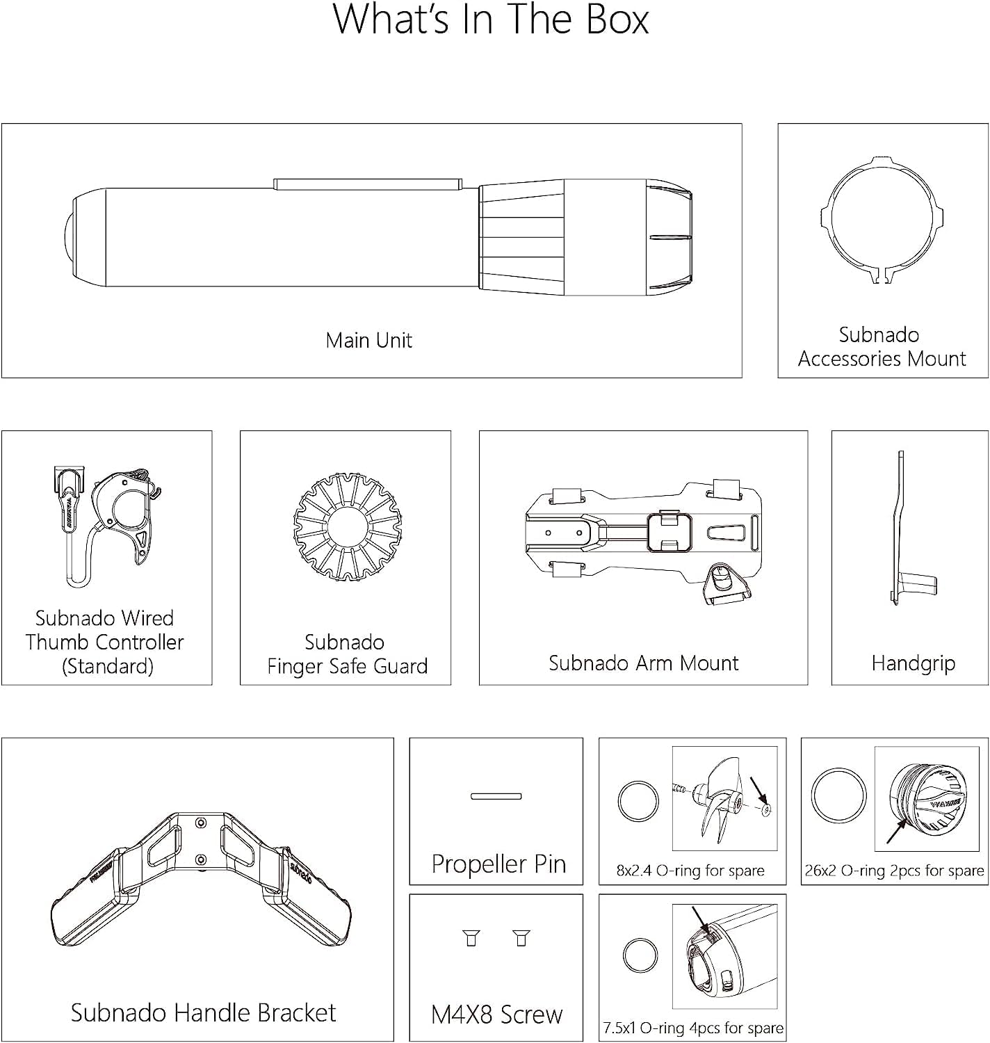 • Subnado Package Includes: Subnado underwater scooter has abundant accessories. They are included: Subnado Main Unit*1. Subnado Accessories Mount*1. Subnado Wired Thumb Controller (Standard)*1. Subnado Finger Safe Guard*1. Subnado Arm Mount*1. Handgrip*1. Subnado Handle Bracket*1. Subnado Wrist Bands*1. Propeller Pin. Screws and several different sizes O-rings for spare. Greatly enhances the fun of underwater activities.