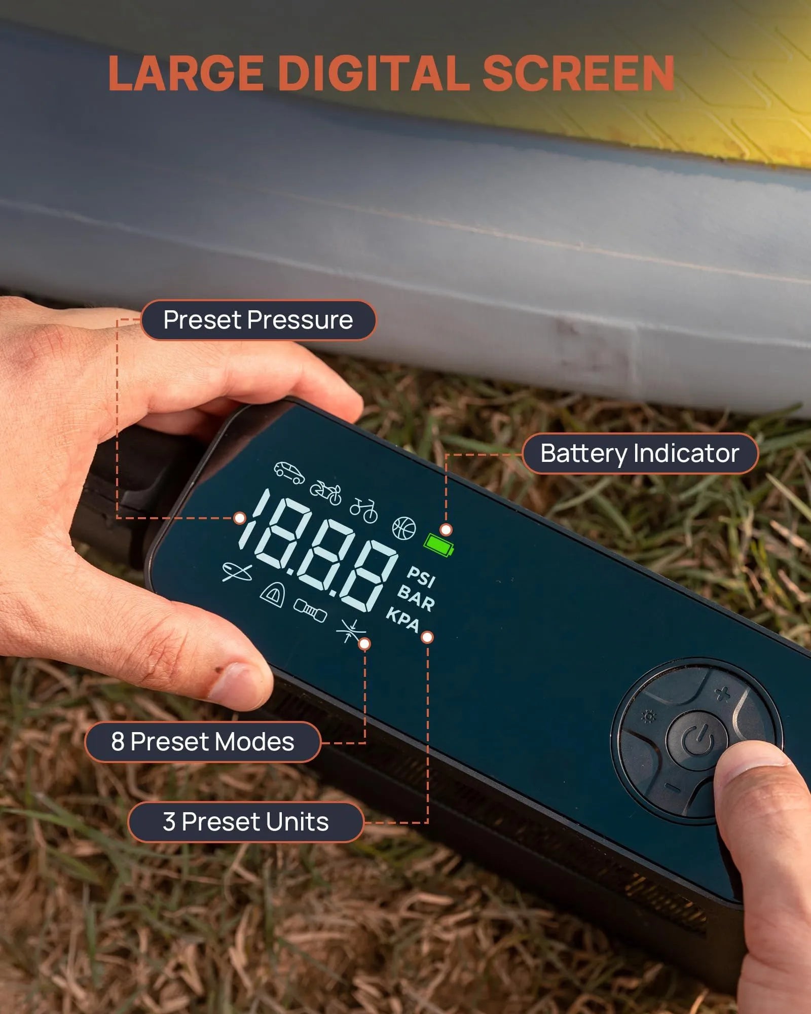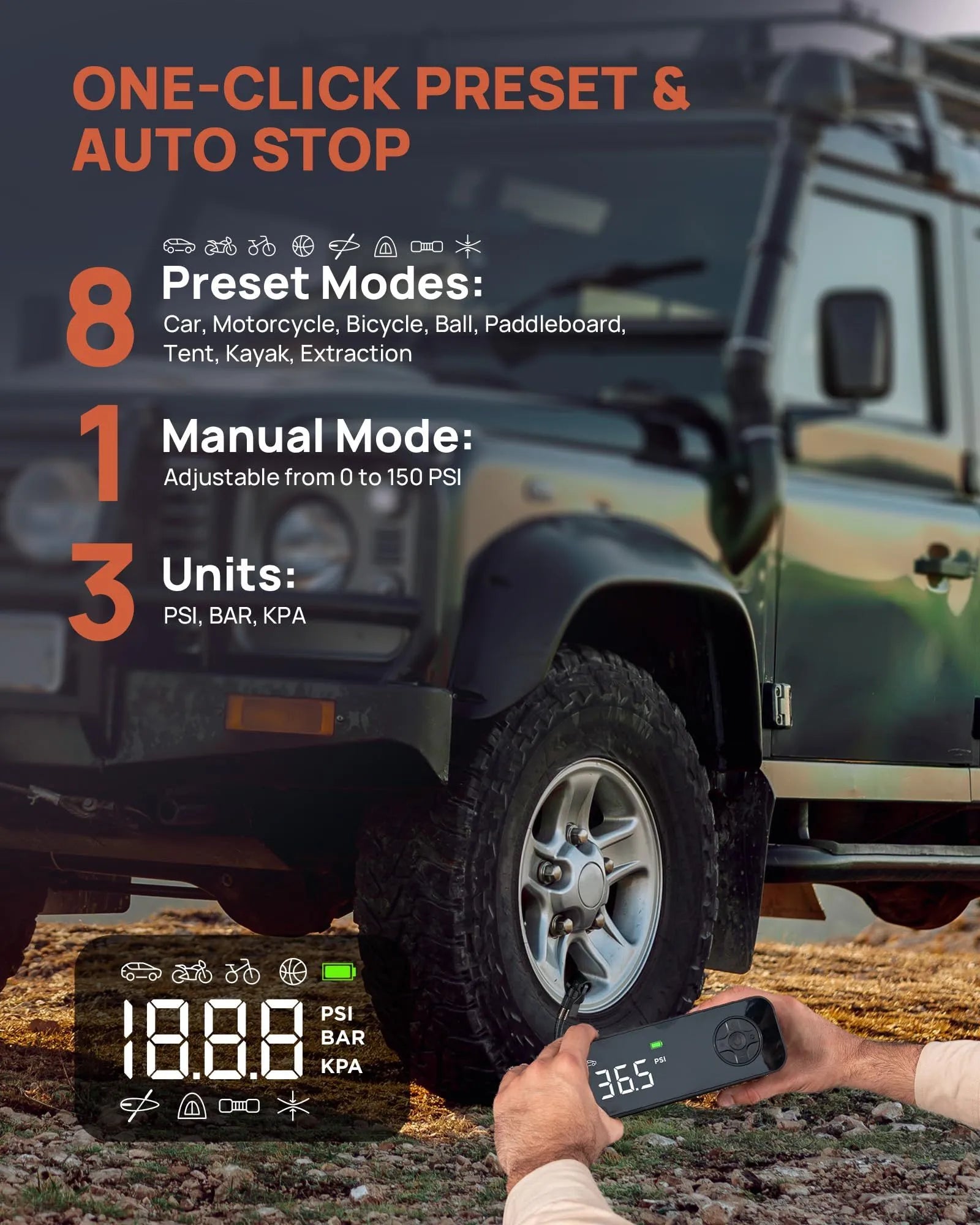 - 8 Modes & Auto Shutoff: This paddle board pump electric portable comes with 10 nozzles and 8 preset modes (car. motorcycle. bicycle. ball. kayak. tent. pumping. surfboard) that automatically shut off when the target pressure is reached. preventing over-inflation and ensuring safety. The manual mode lets you adjust pressure up to 150 PSI. The smart LED display shows preset values with 3 pressure units (PSI. KPA. BAR) for easy monitoring.