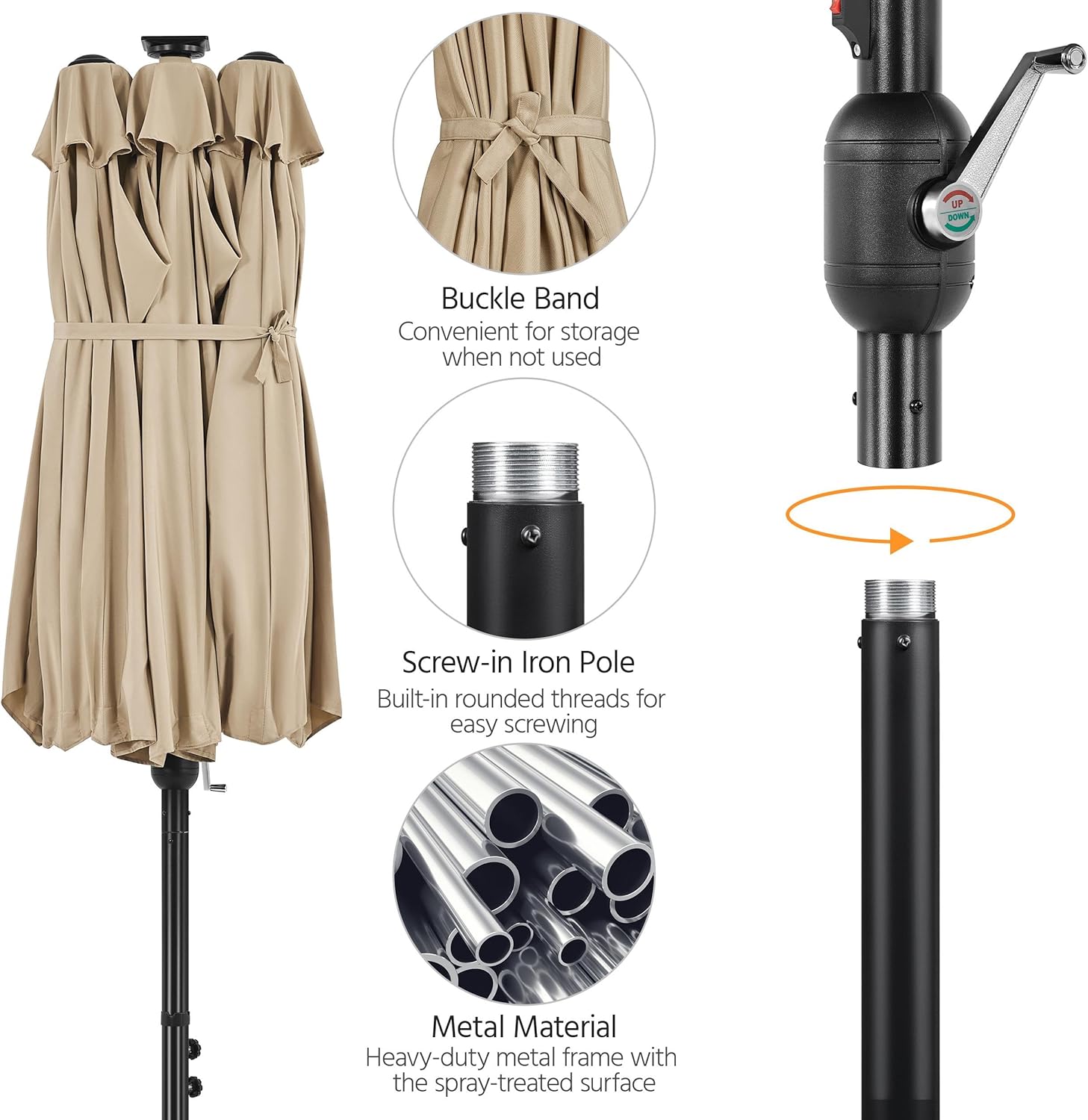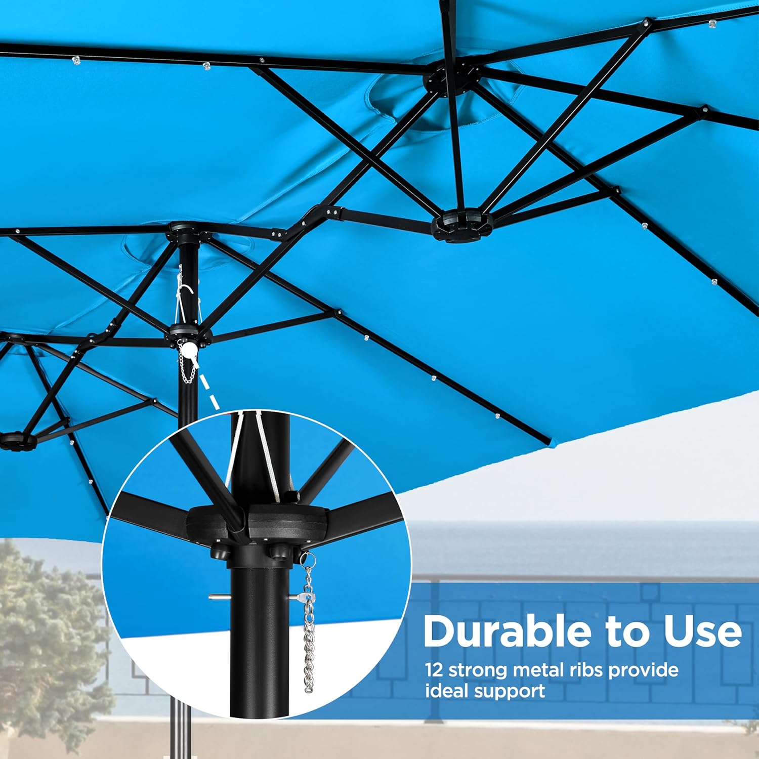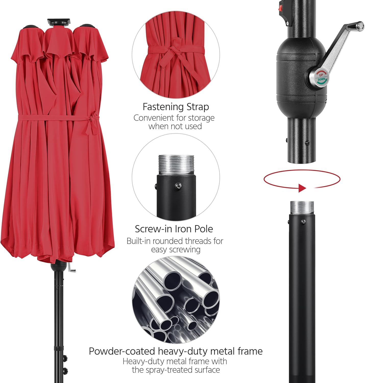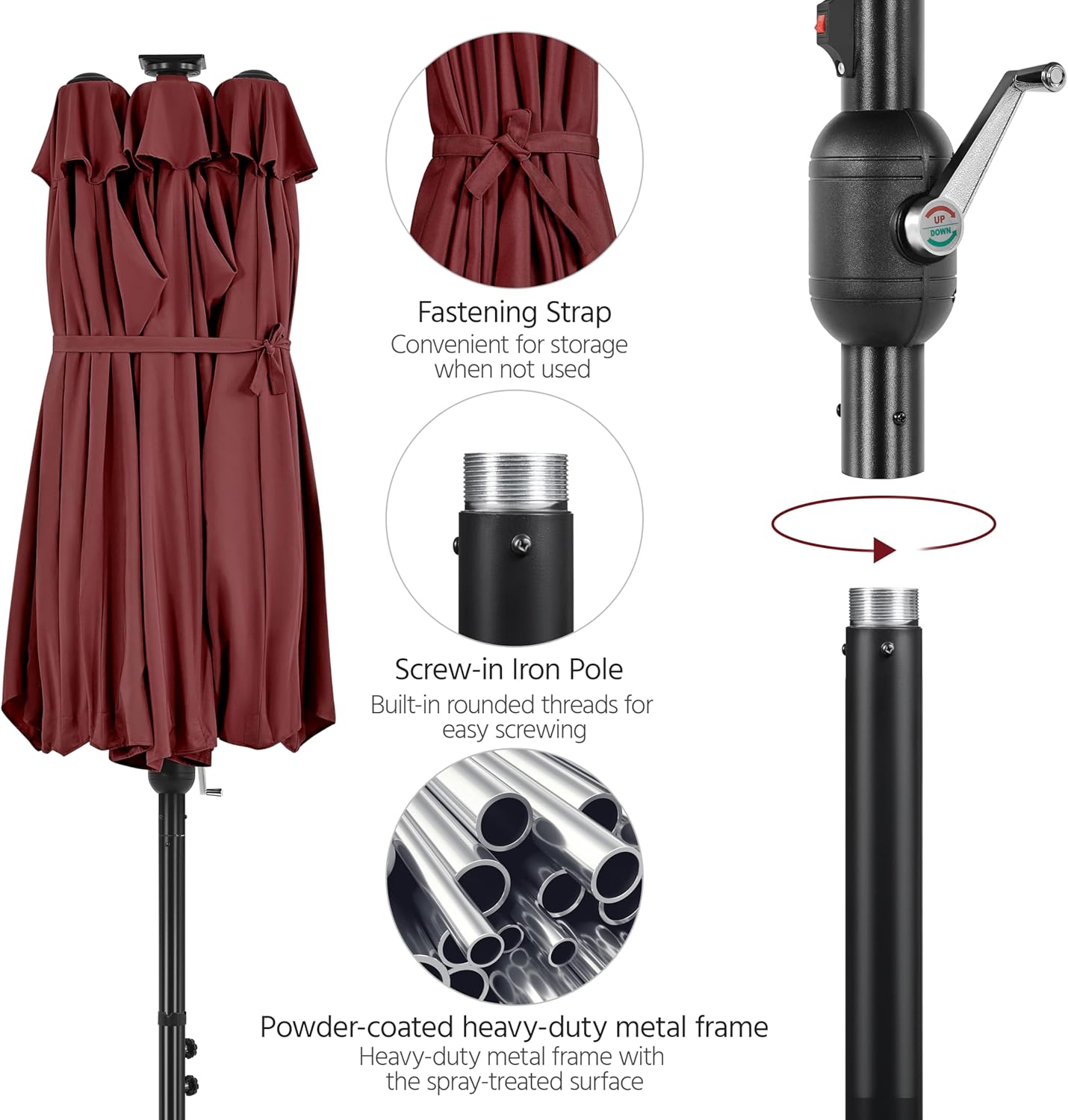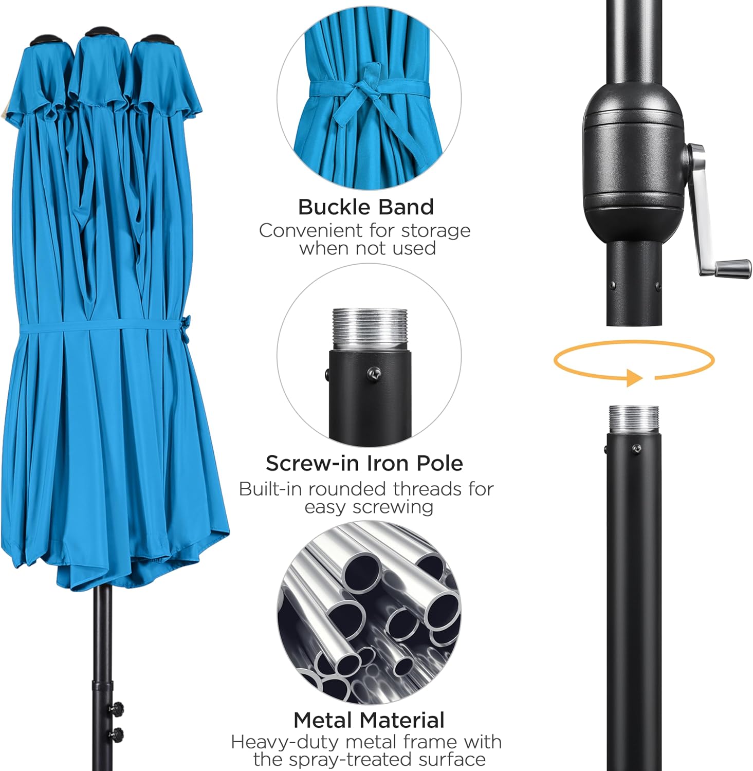 • Generous Shade: Featuring a 15ft regular dodecagon-shaped canopy. this twin patio parasol is designed to provide ample shade for large outdoor gatherings. It's spacious enough to accommodate your family and friends. allowing everyone to relax and enjoy quality time in the yard. garden. park. patio. or at the beach