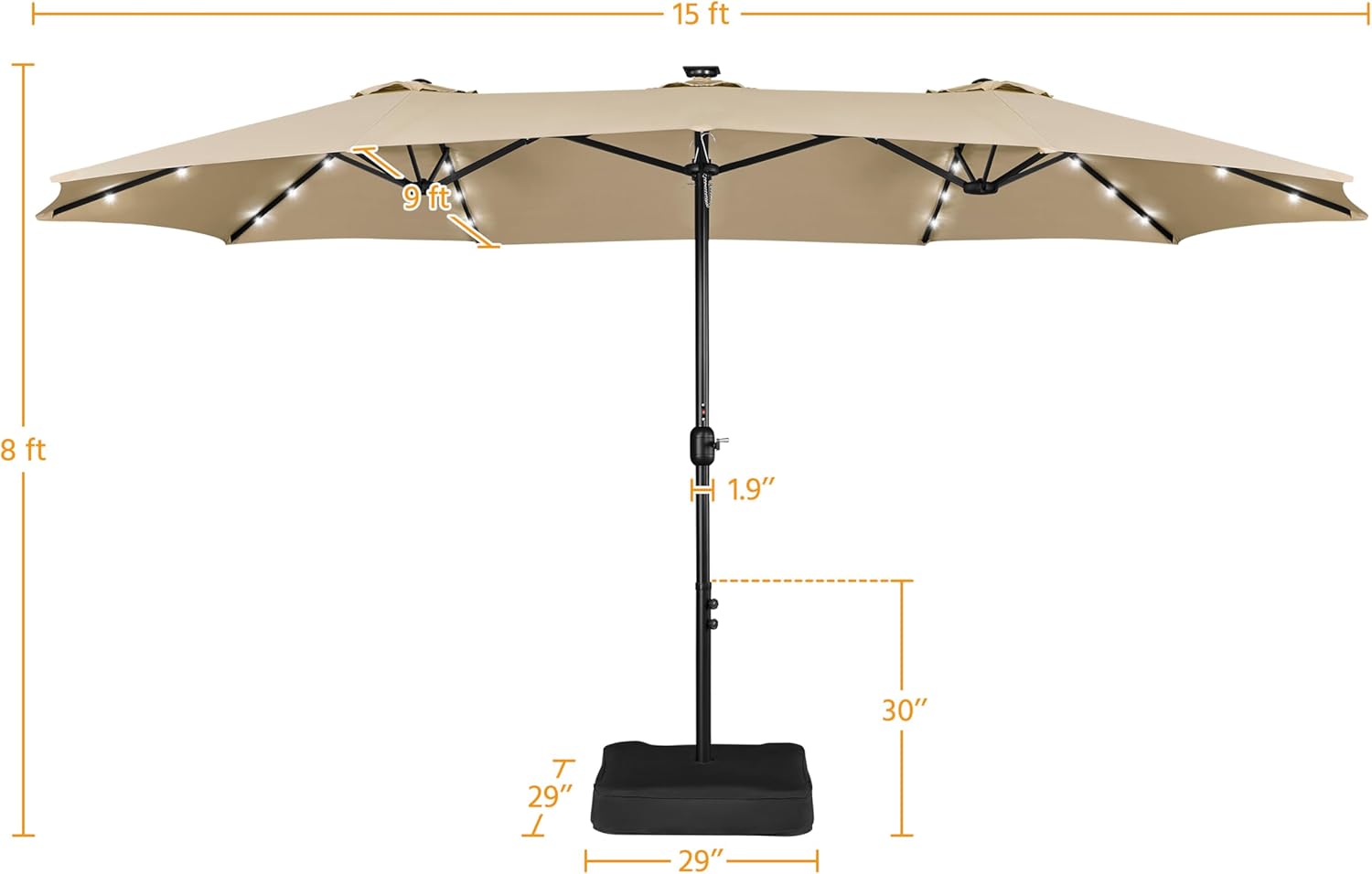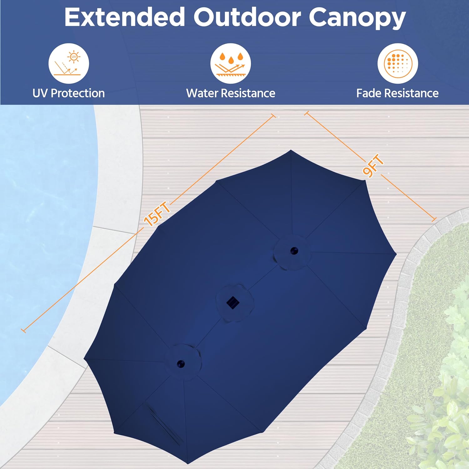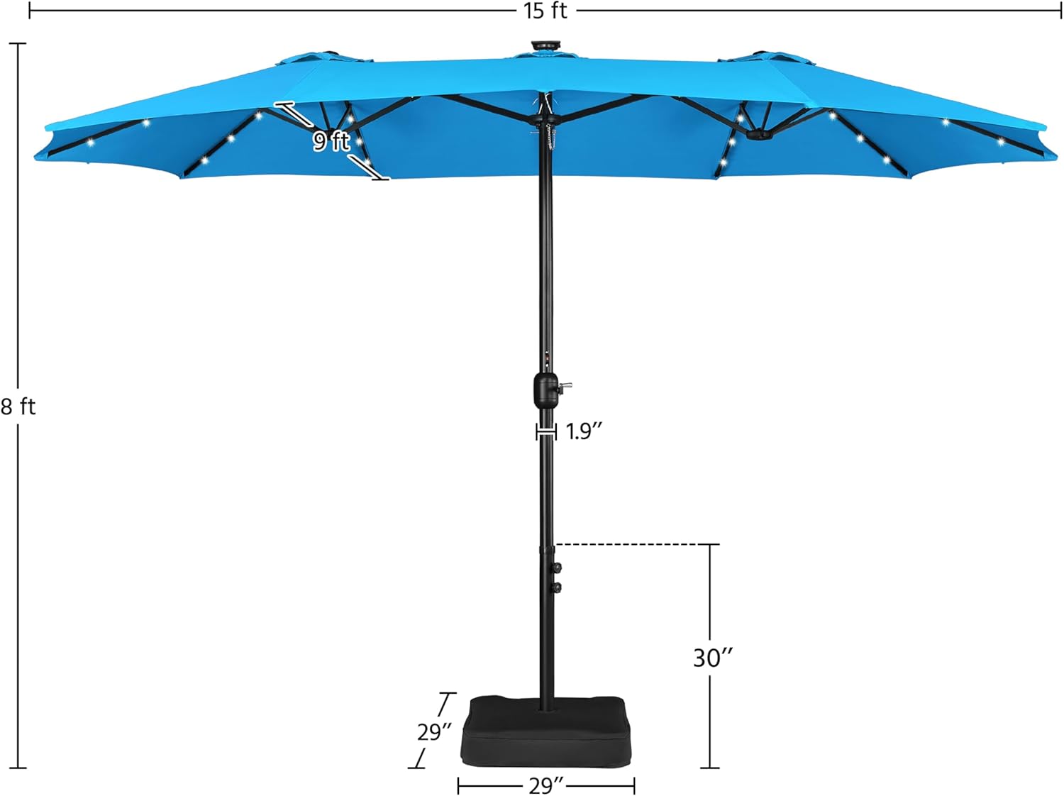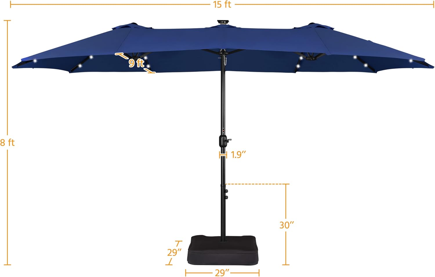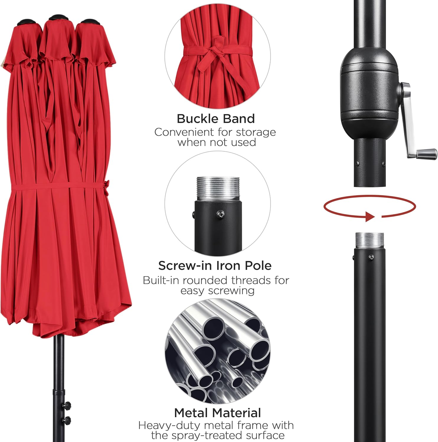 • Generous Shade: Featuring a 15ft regular dodecagon-shaped canopy. this twin patio parasol is designed to provide ample shade for large outdoor gatherings. It's spacious enough to accommodate your family and friends. allowing everyone to relax and enjoy quality time in the yard. garden. park. patio. or at the beach