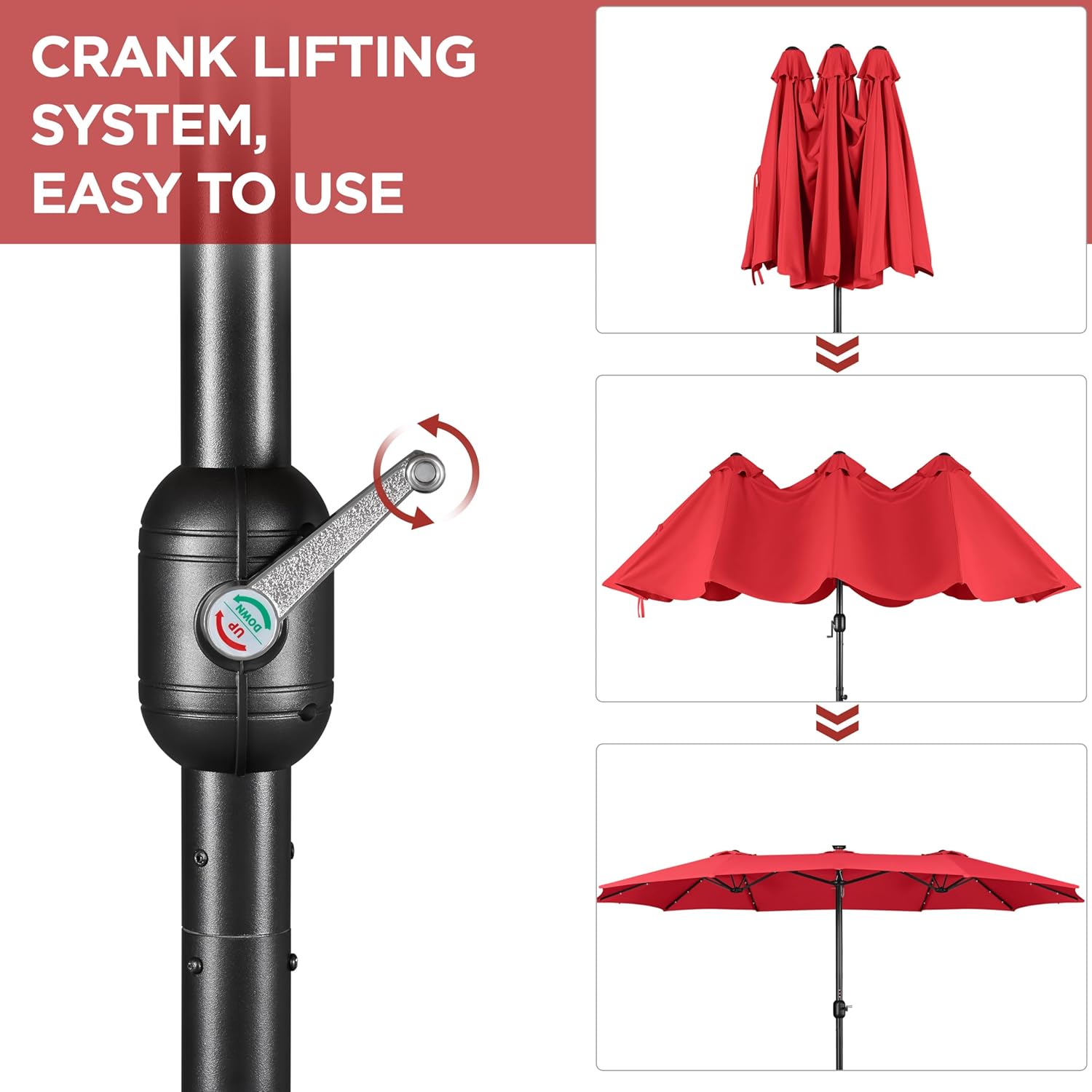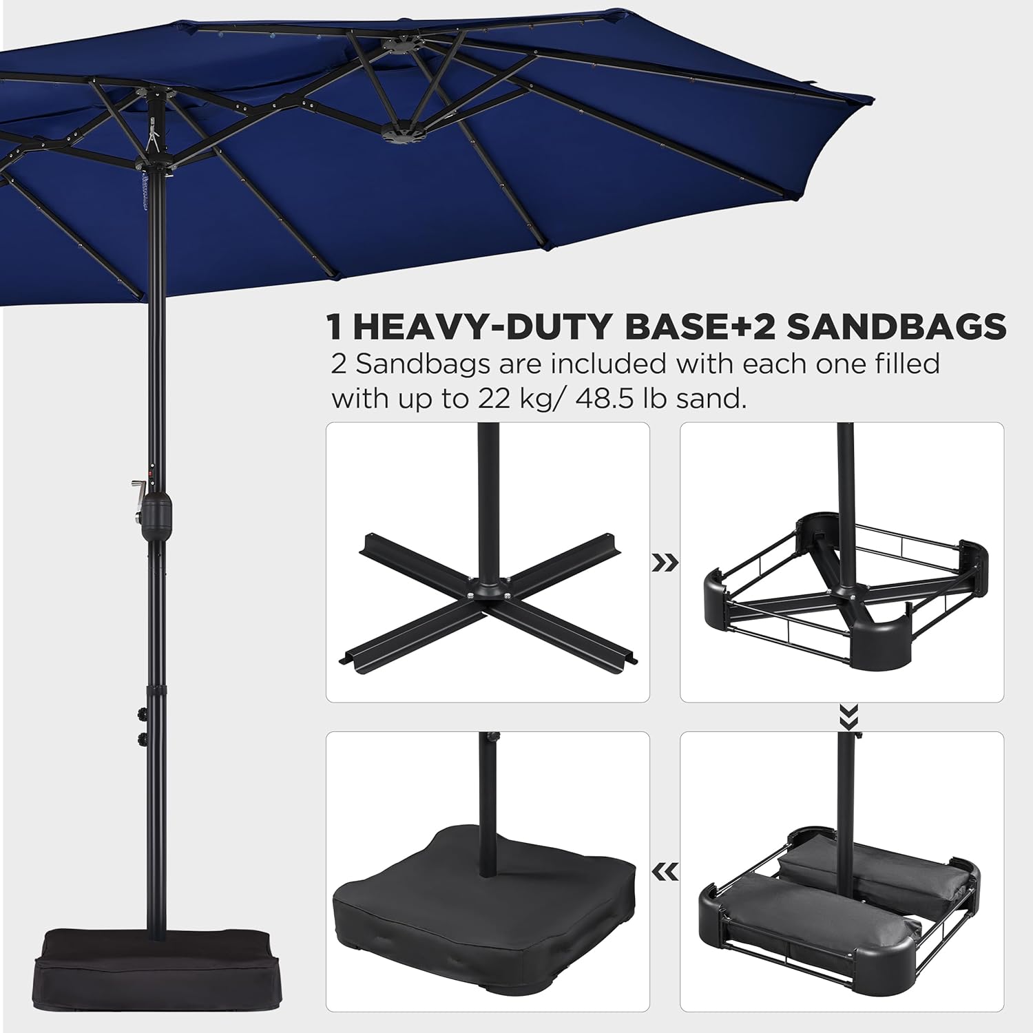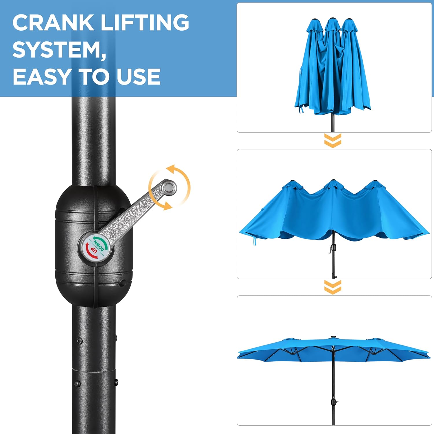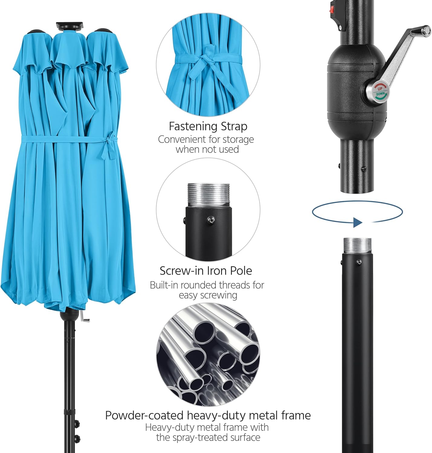 • Generous Shade: Featuring a 15ft regular dodecagon-shaped canopy. this twin patio parasol is designed to provide ample shade for large outdoor gatherings. It's spacious enough to accommodate your family and friends. allowing everyone to relax and enjoy quality time in the yard. garden. park. patio. or at the beach