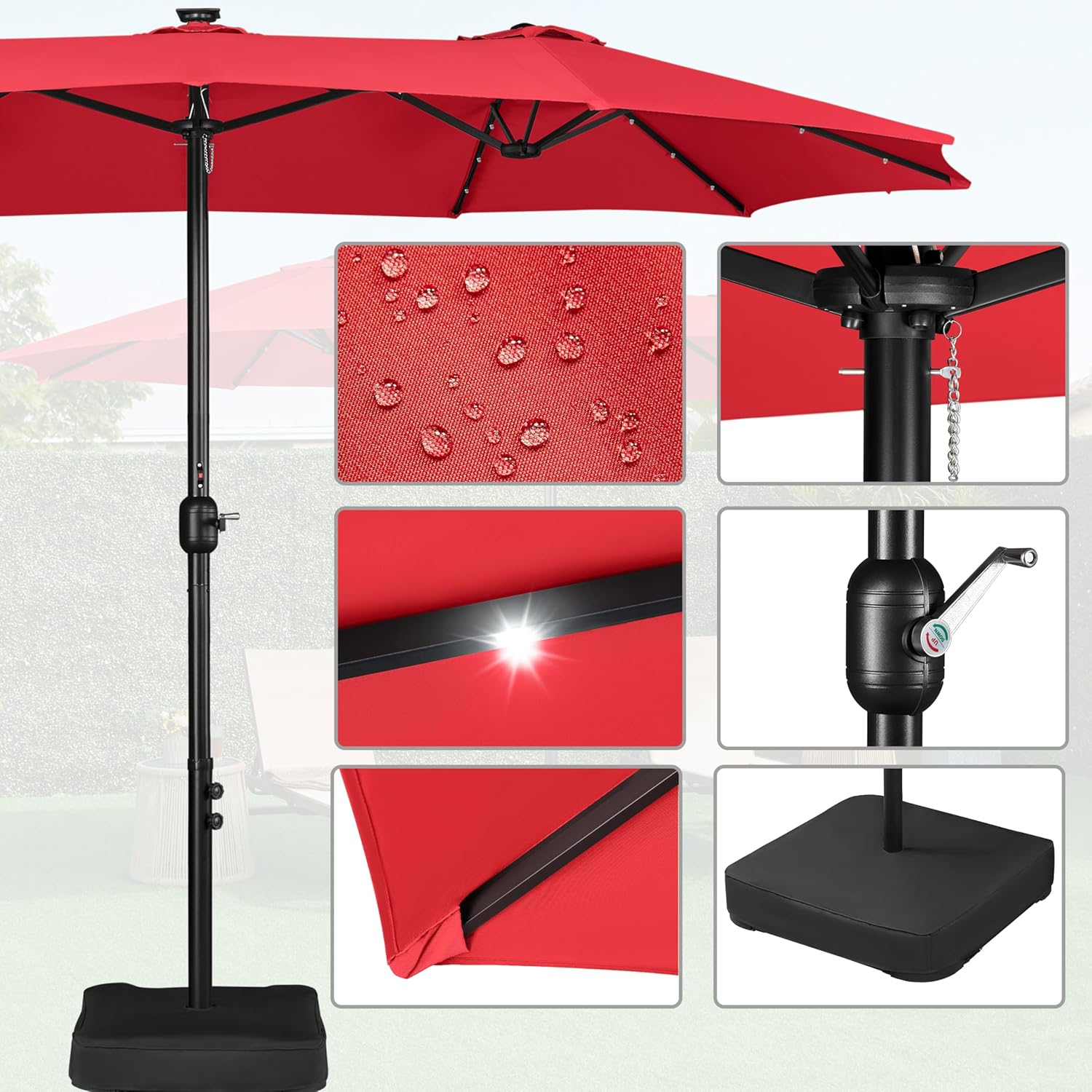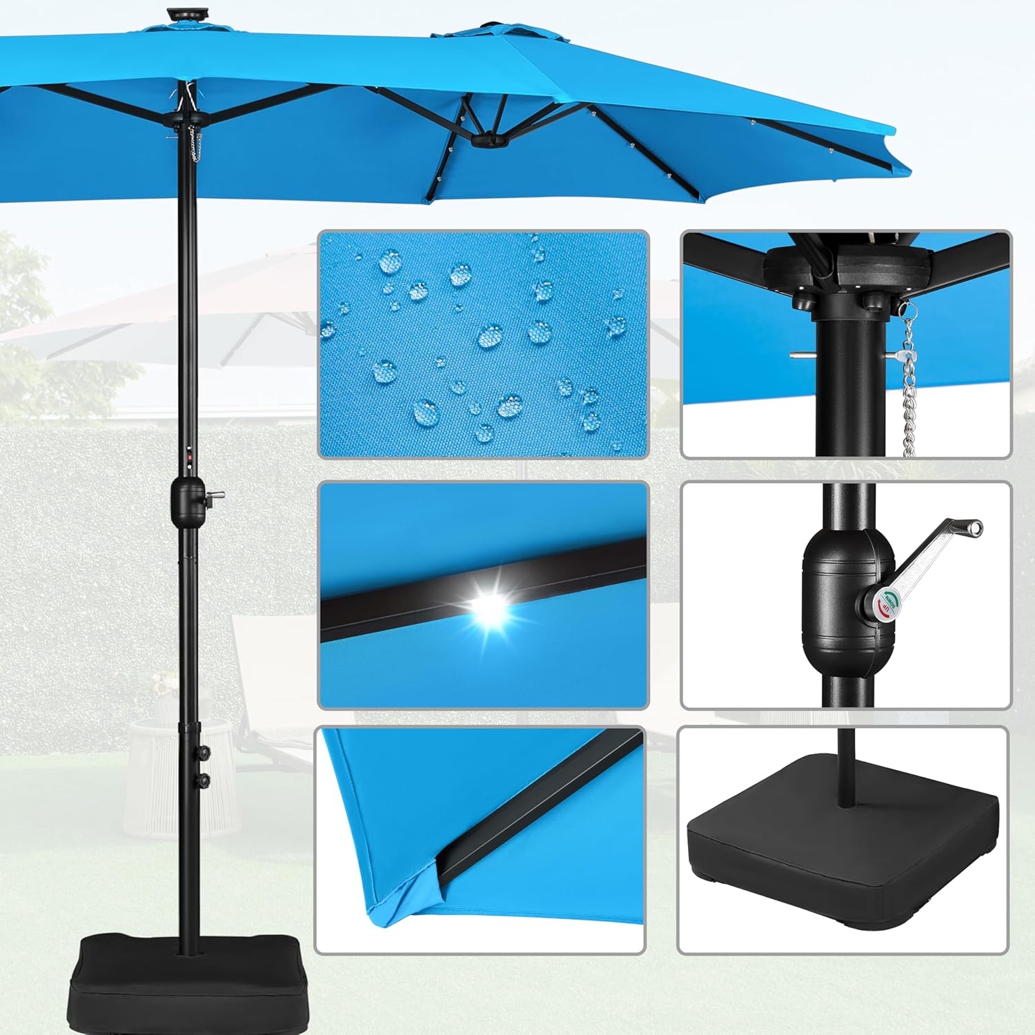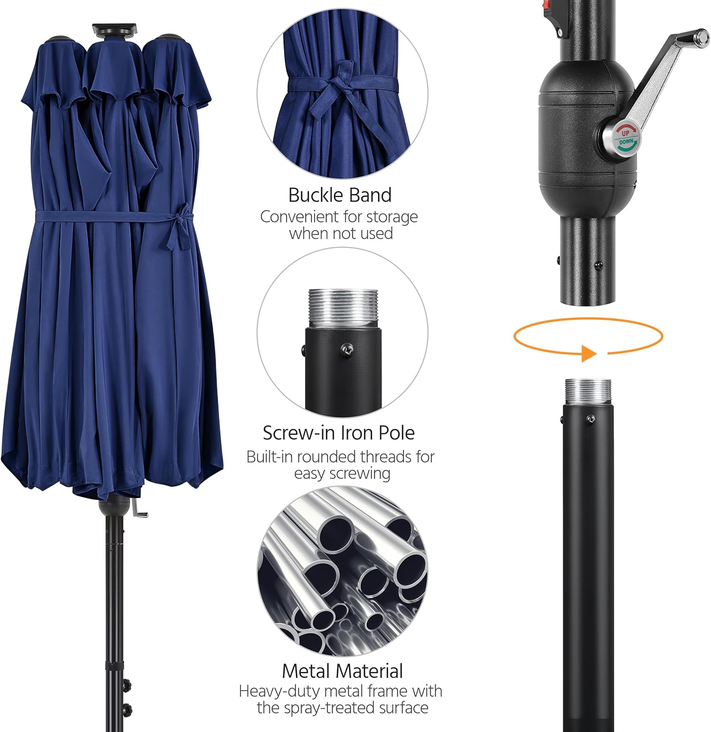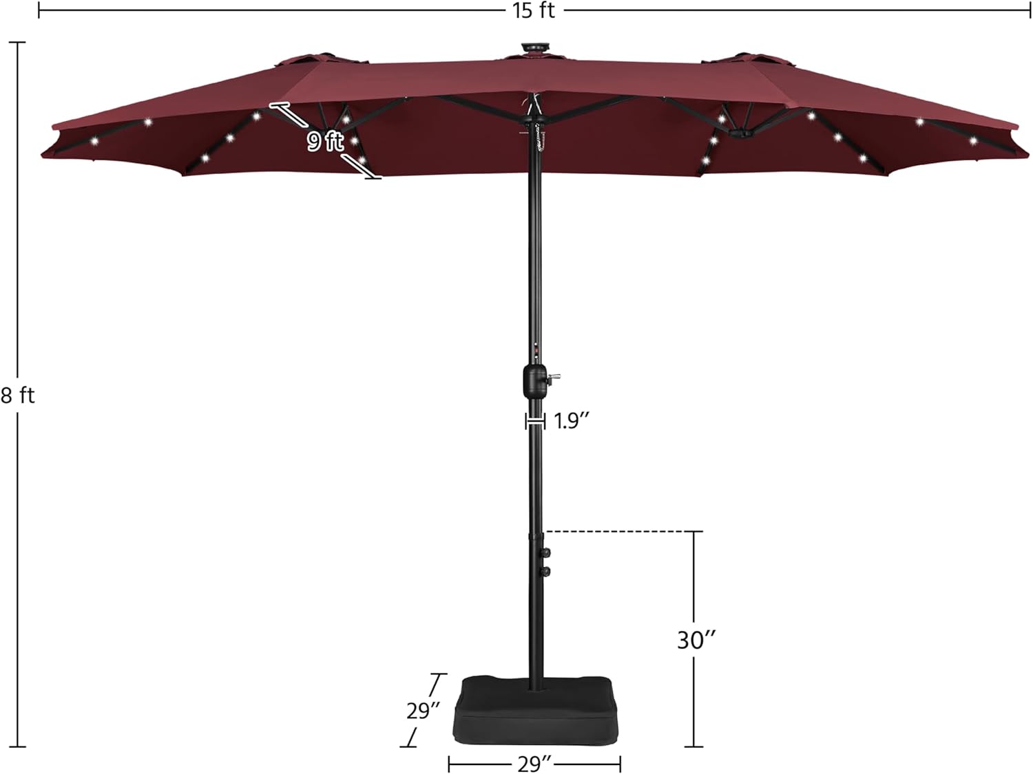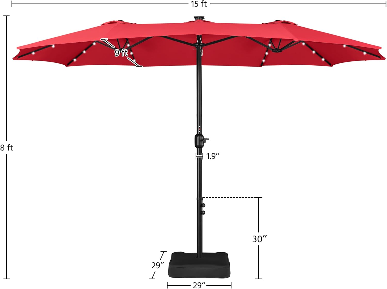 • Generous Shade: Featuring a 15ft regular dodecagon-shaped canopy. this twin patio parasol is designed to provide ample shade for large outdoor gatherings. It's spacious enough to accommodate your family and friends. allowing everyone to relax and enjoy quality time in the yard. garden. park. patio. or at the beach