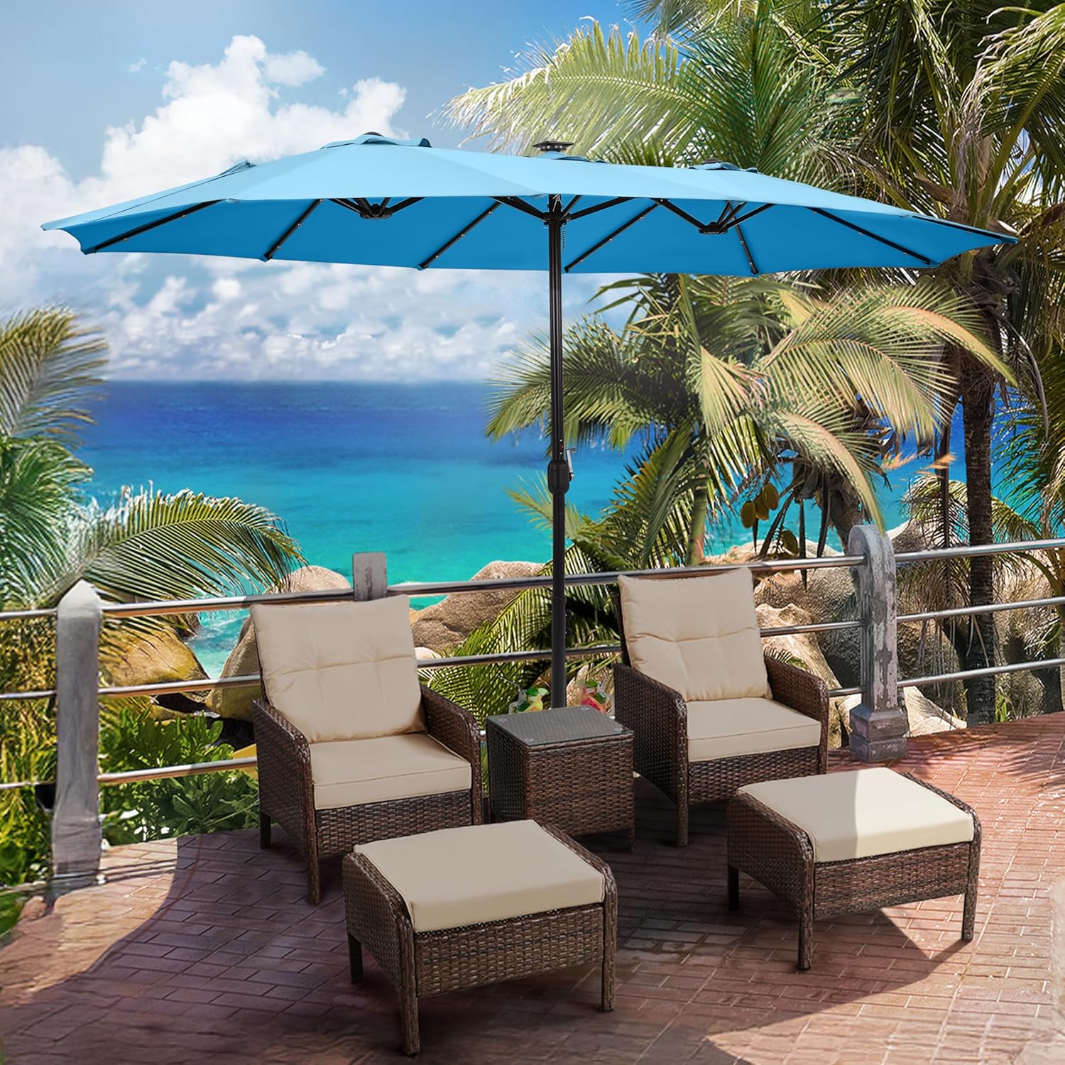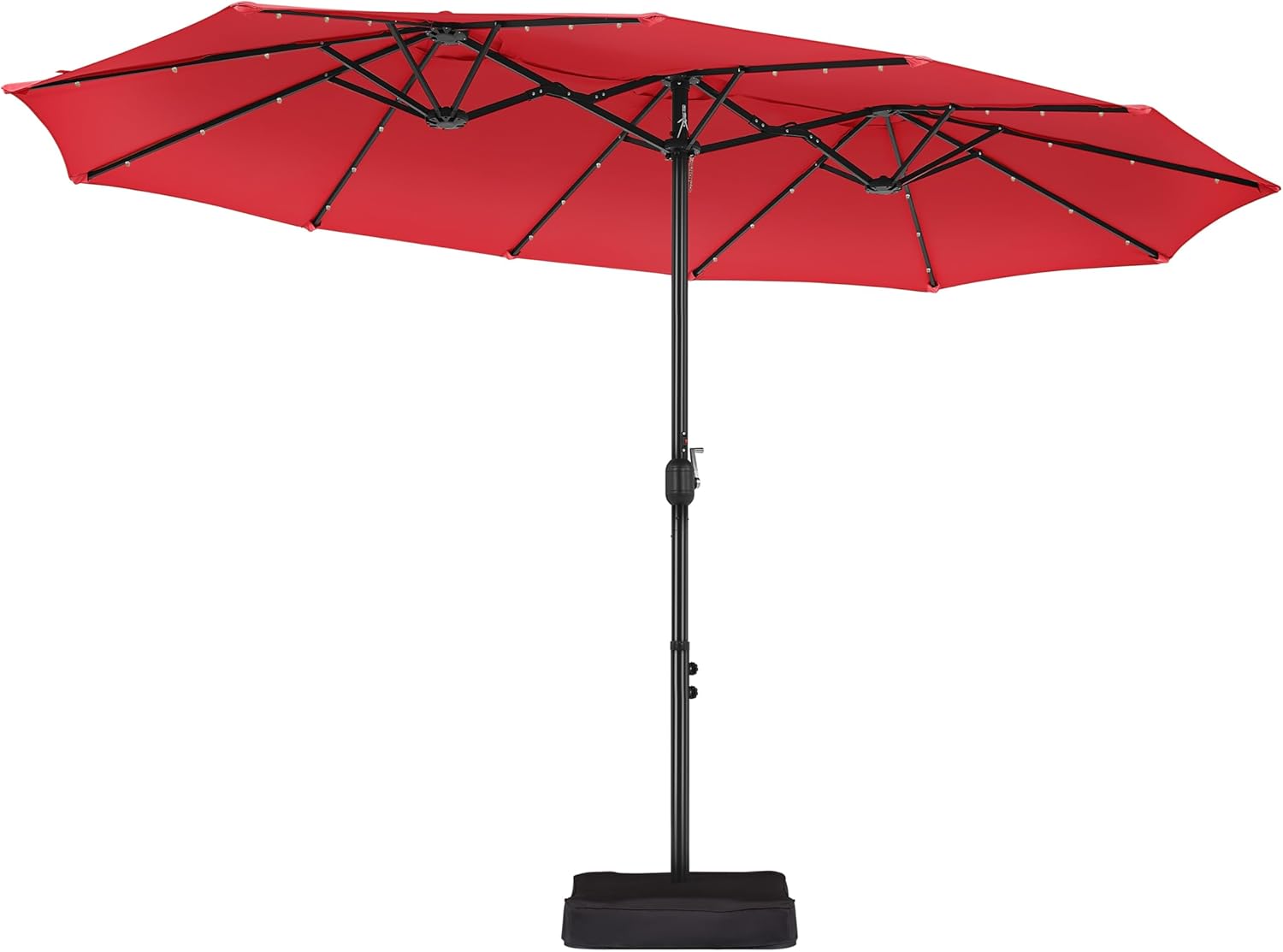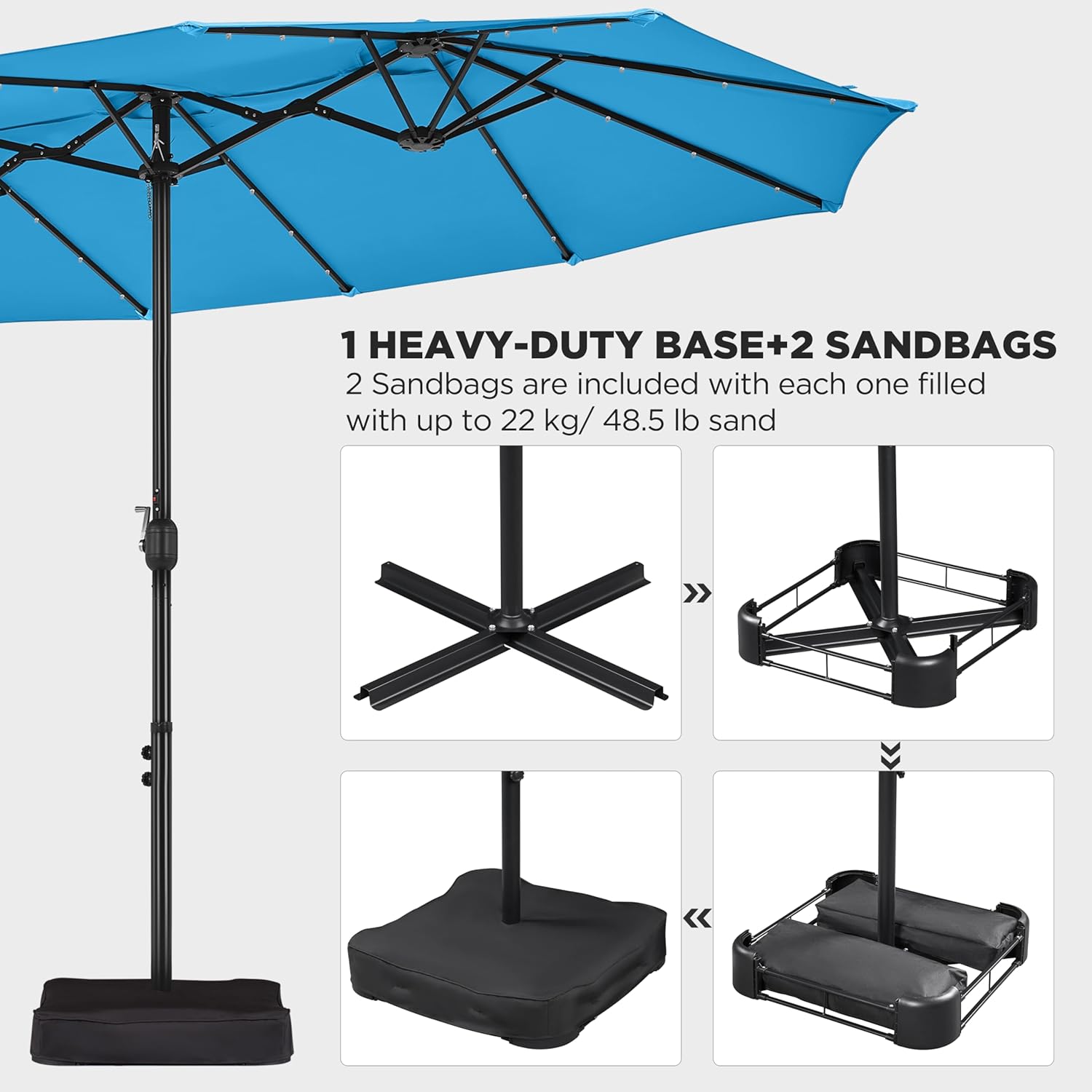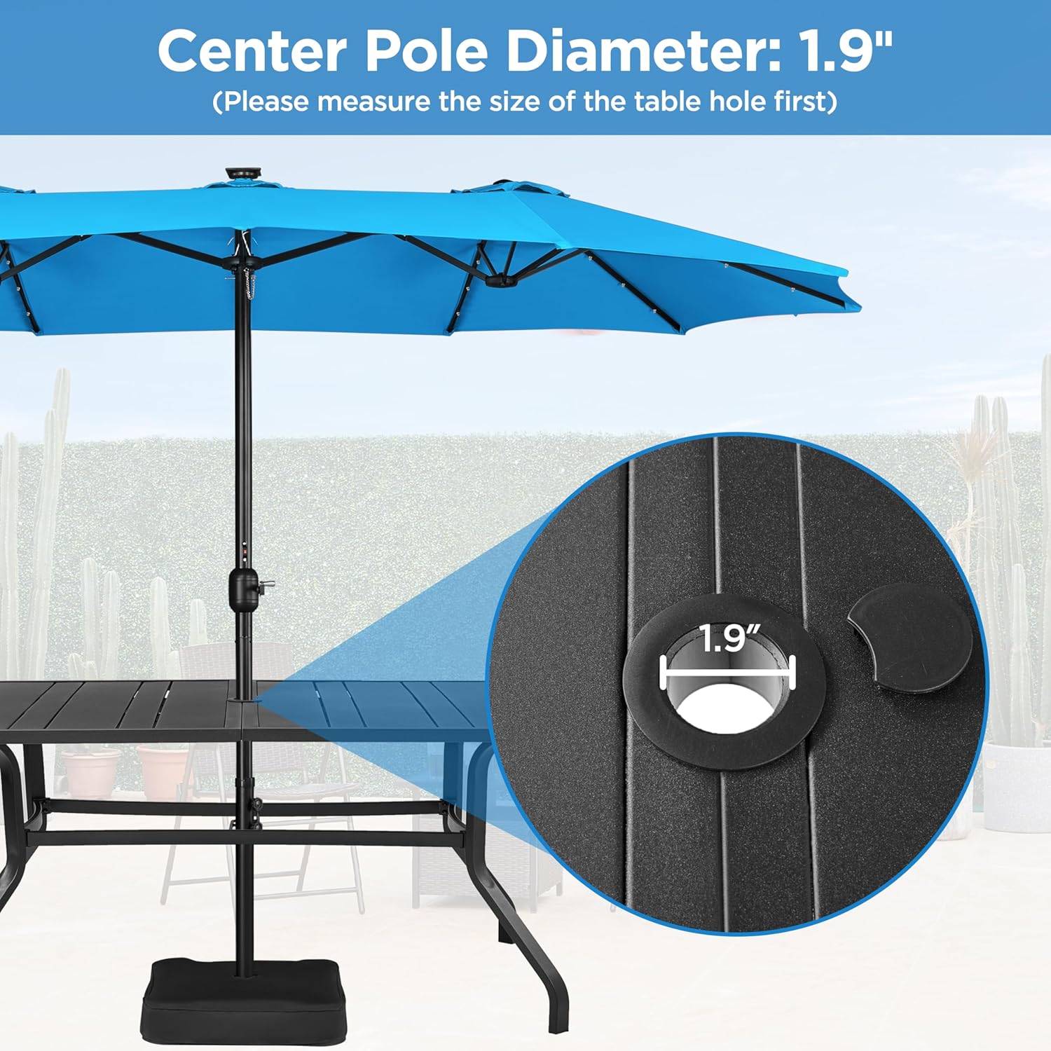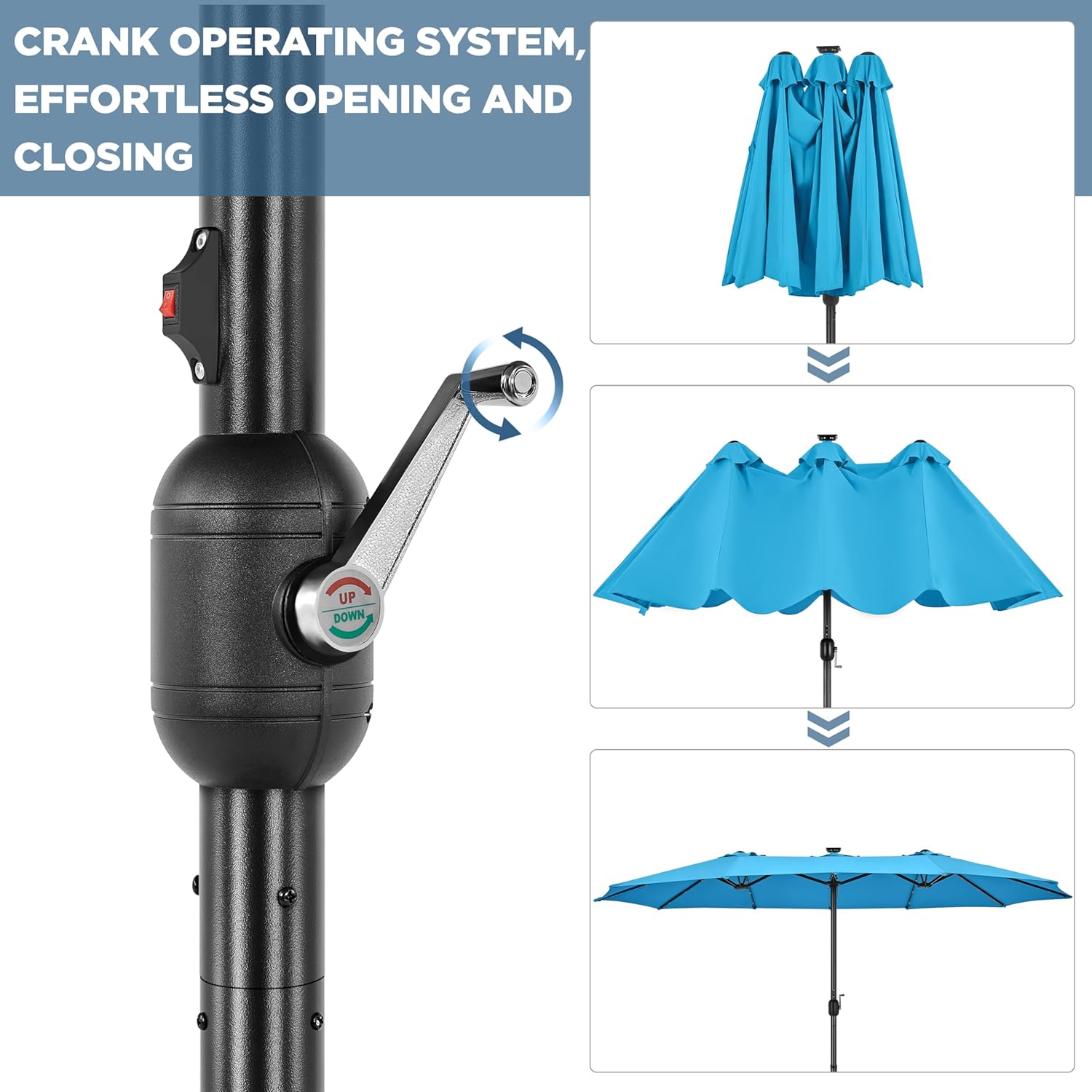 • Generous Shade: Featuring a 15ft regular dodecagon-shaped canopy. this twin patio parasol is designed to provide ample shade for large outdoor gatherings. It's spacious enough to accommodate your family and friends. allowing everyone to relax and enjoy quality time in the yard. garden. park. patio. or at the beach