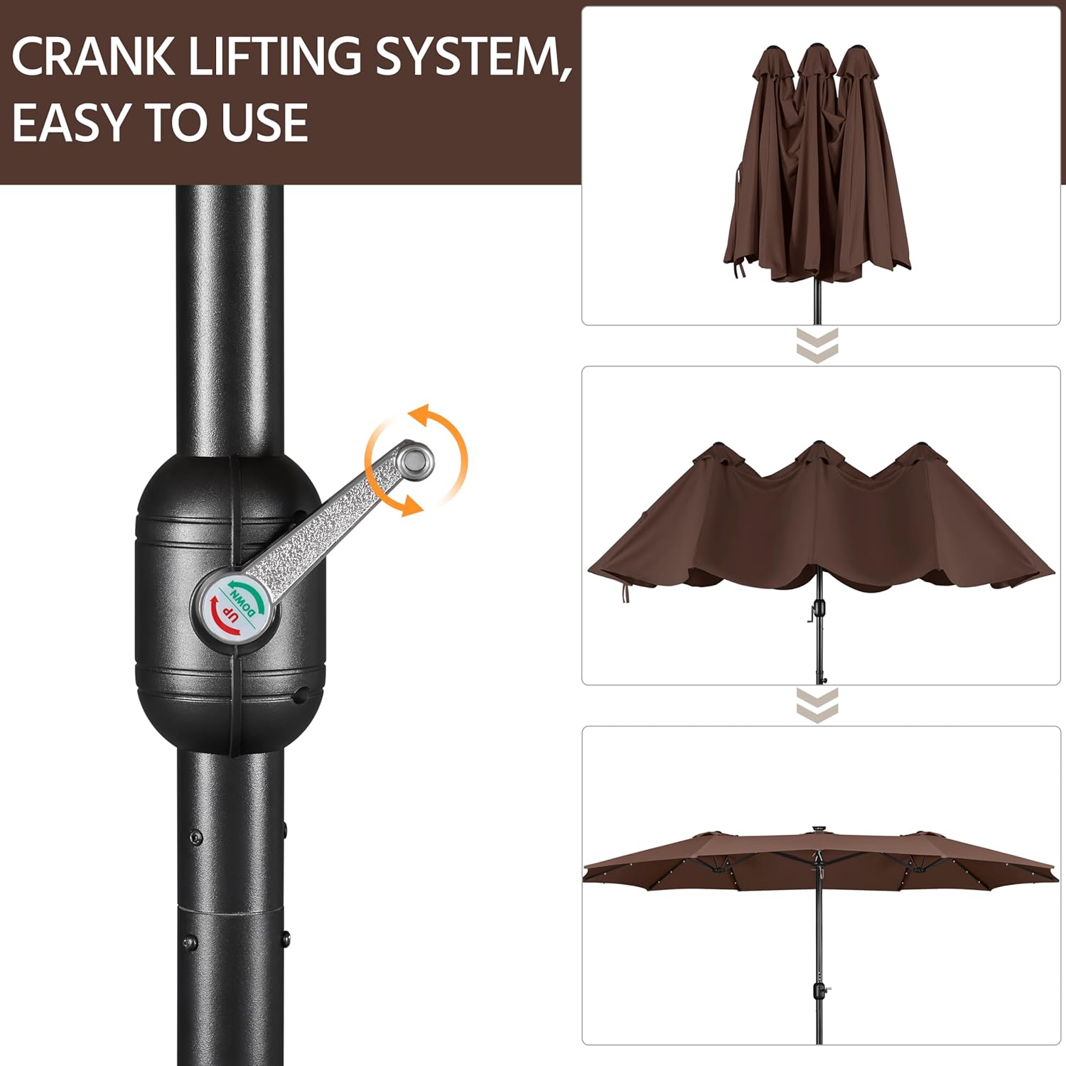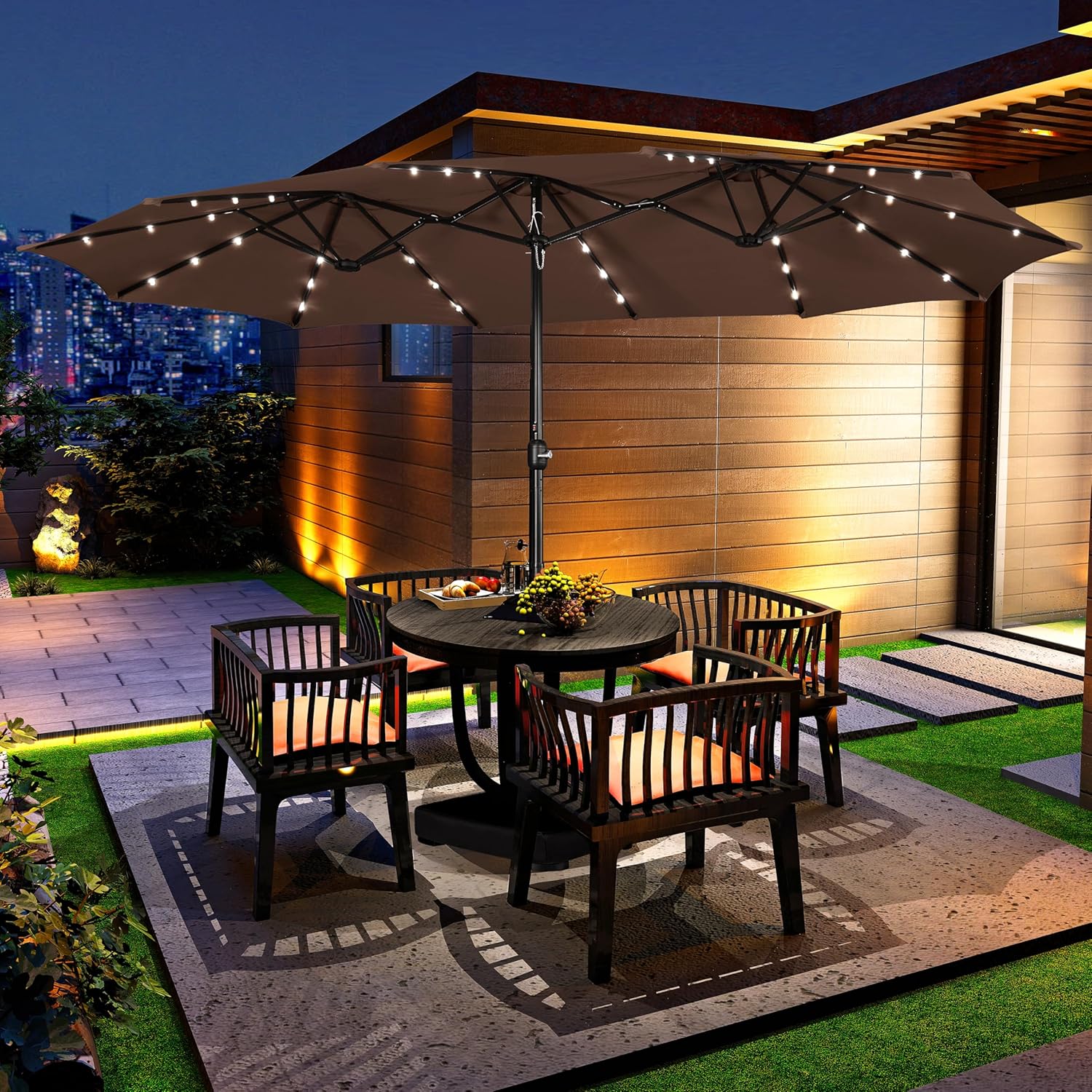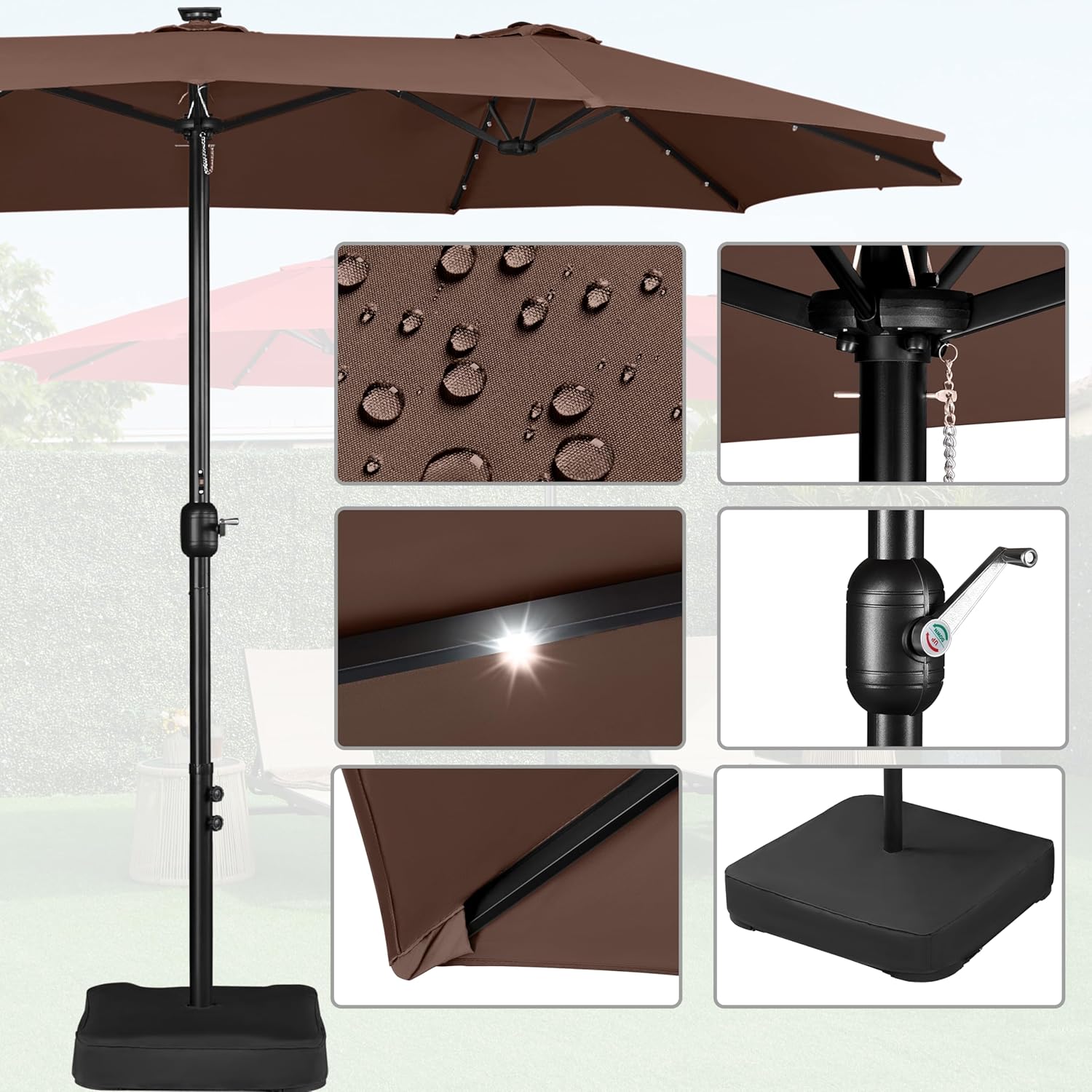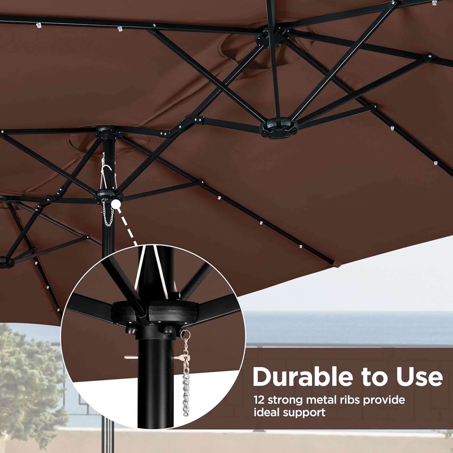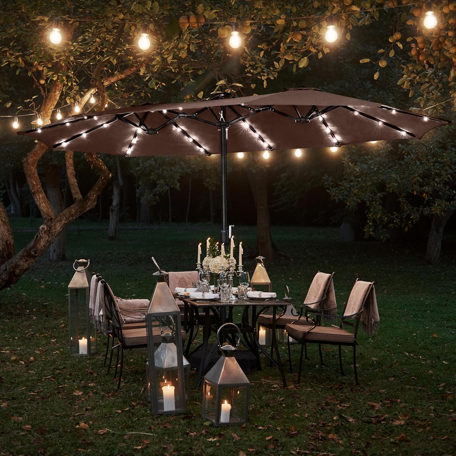 • 15 ft Large Patio Umbrella with Solar Lights Double-Sided Outdoor Rectangle Market Umbrellas with 36 LED Lights/Base Included/Easy Crank for Patio Garden Yard Pool Lawn, Brown