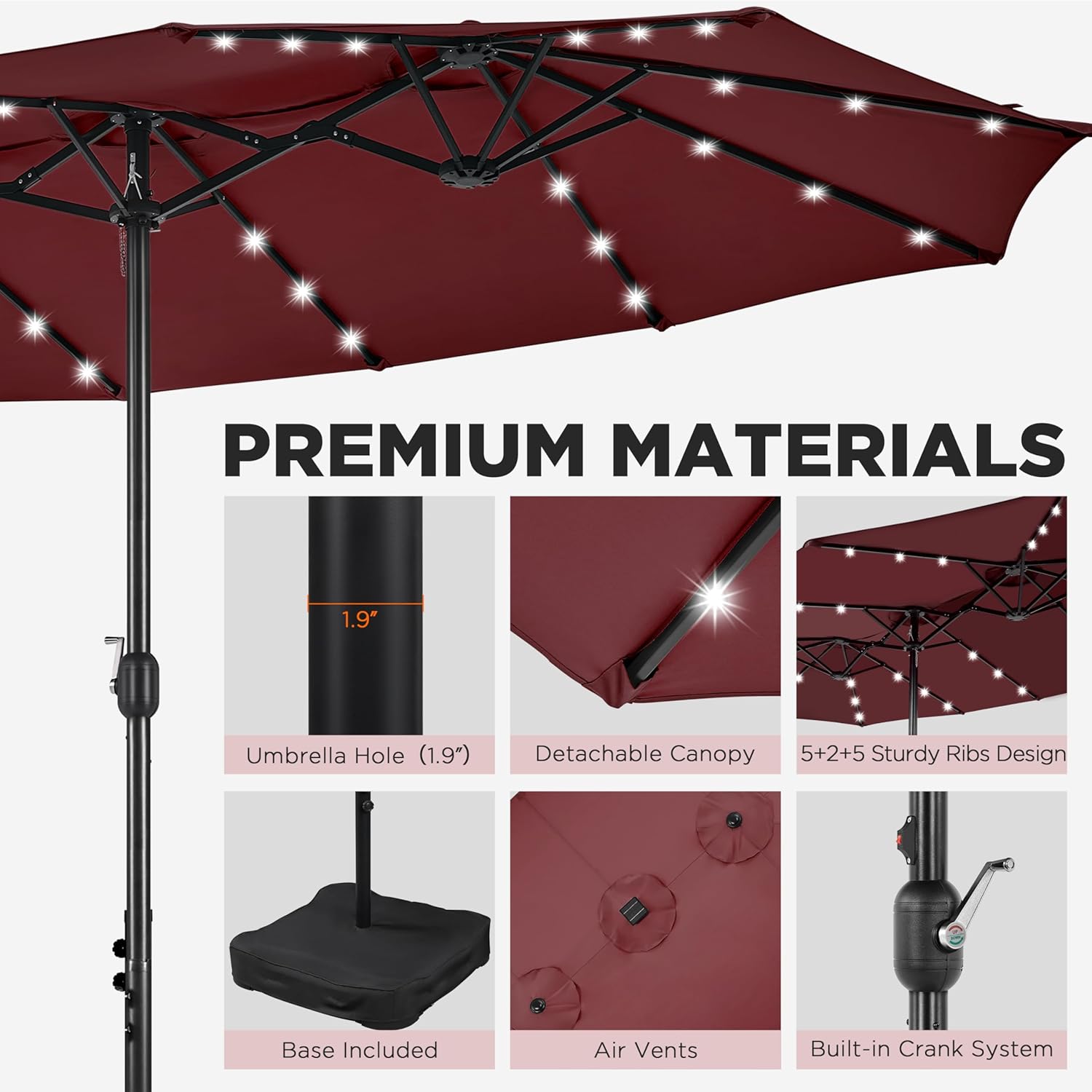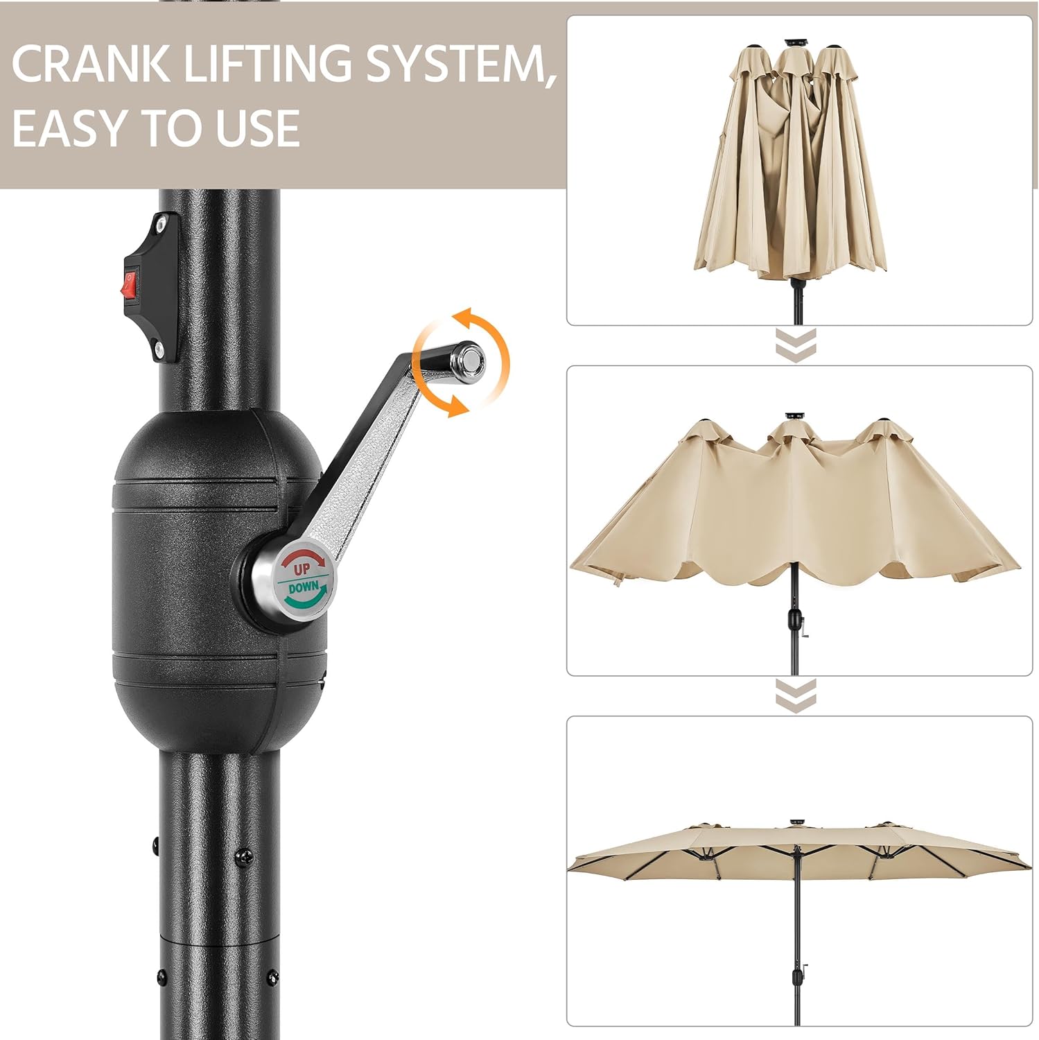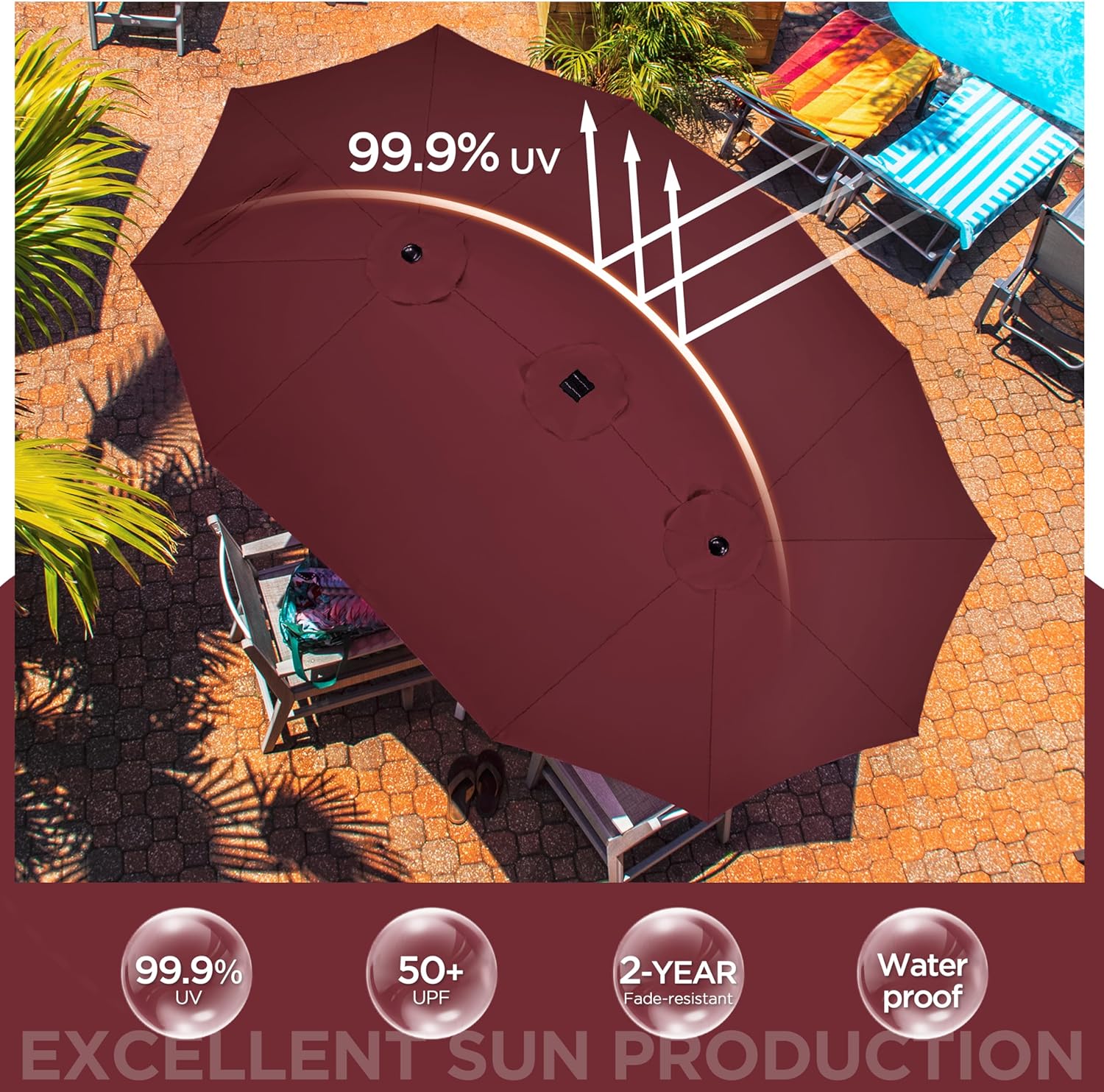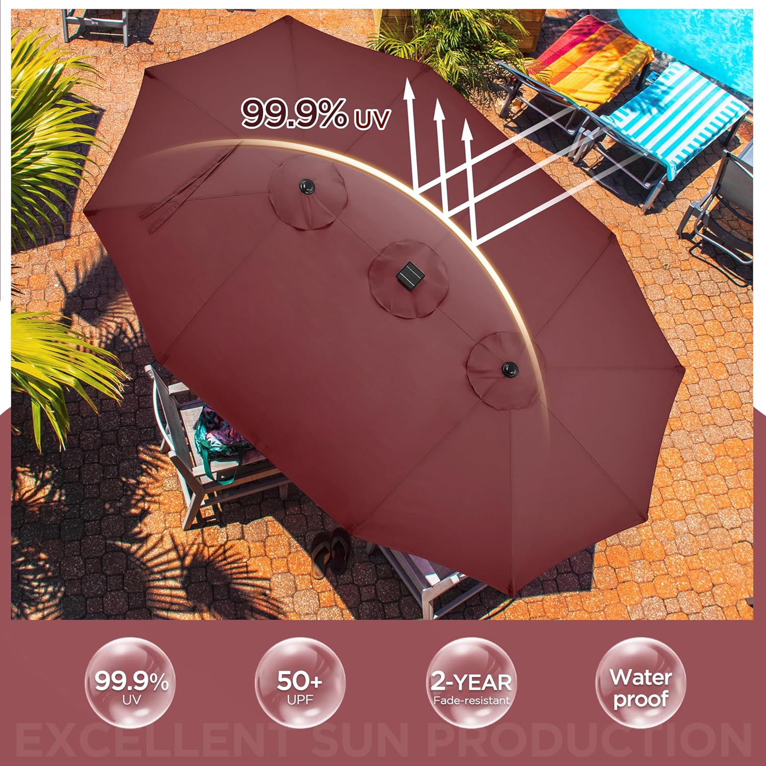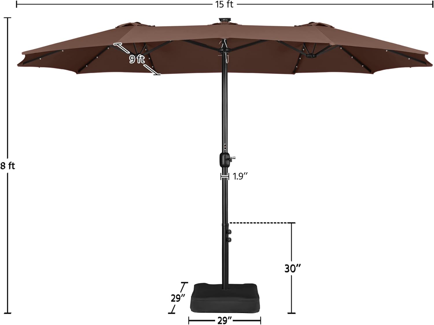 • 15 ft Large Patio Umbrella with Solar Lights Double-Sided Outdoor Rectangle Market Umbrellas with 36 LED Lights/Base Included/Easy Crank for Patio Garden Yard Pool Lawn, Brown