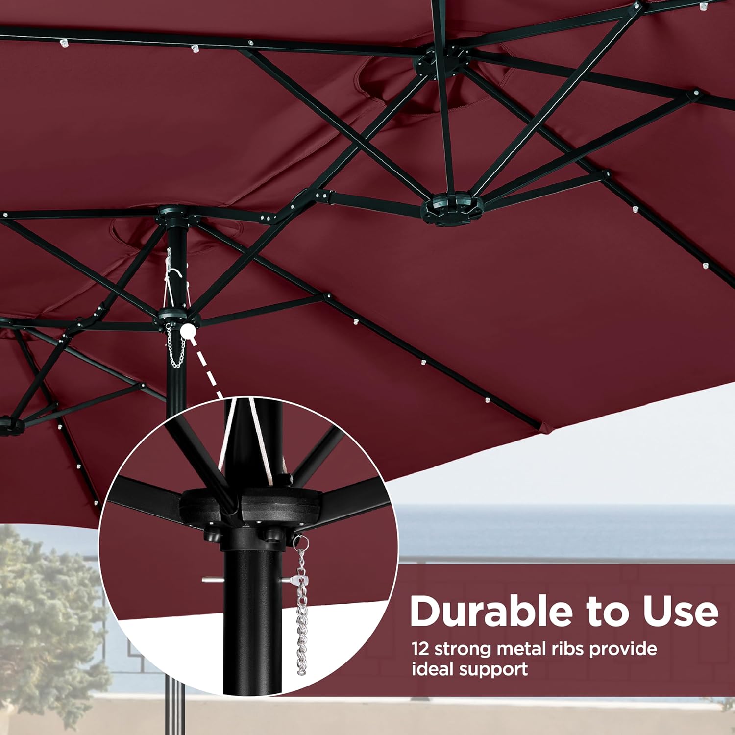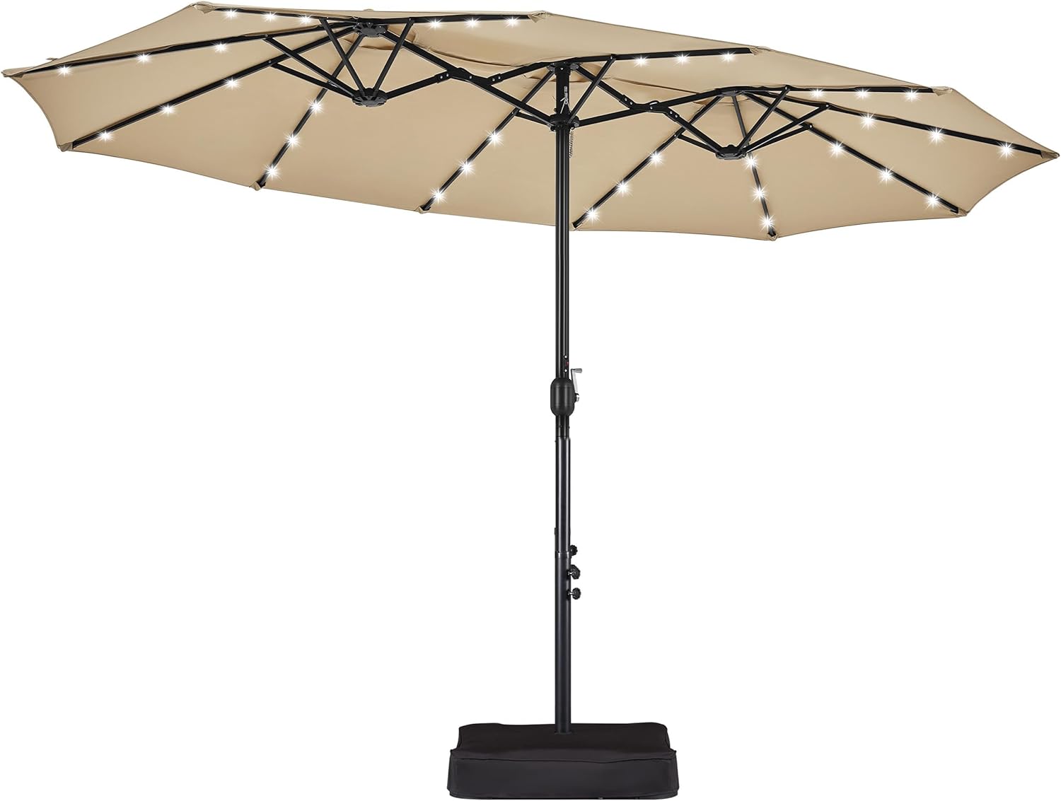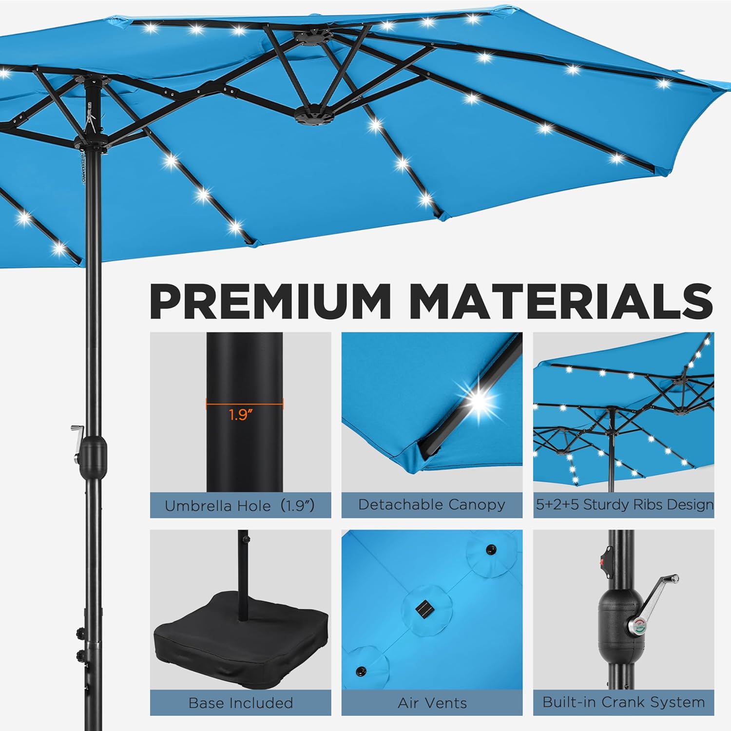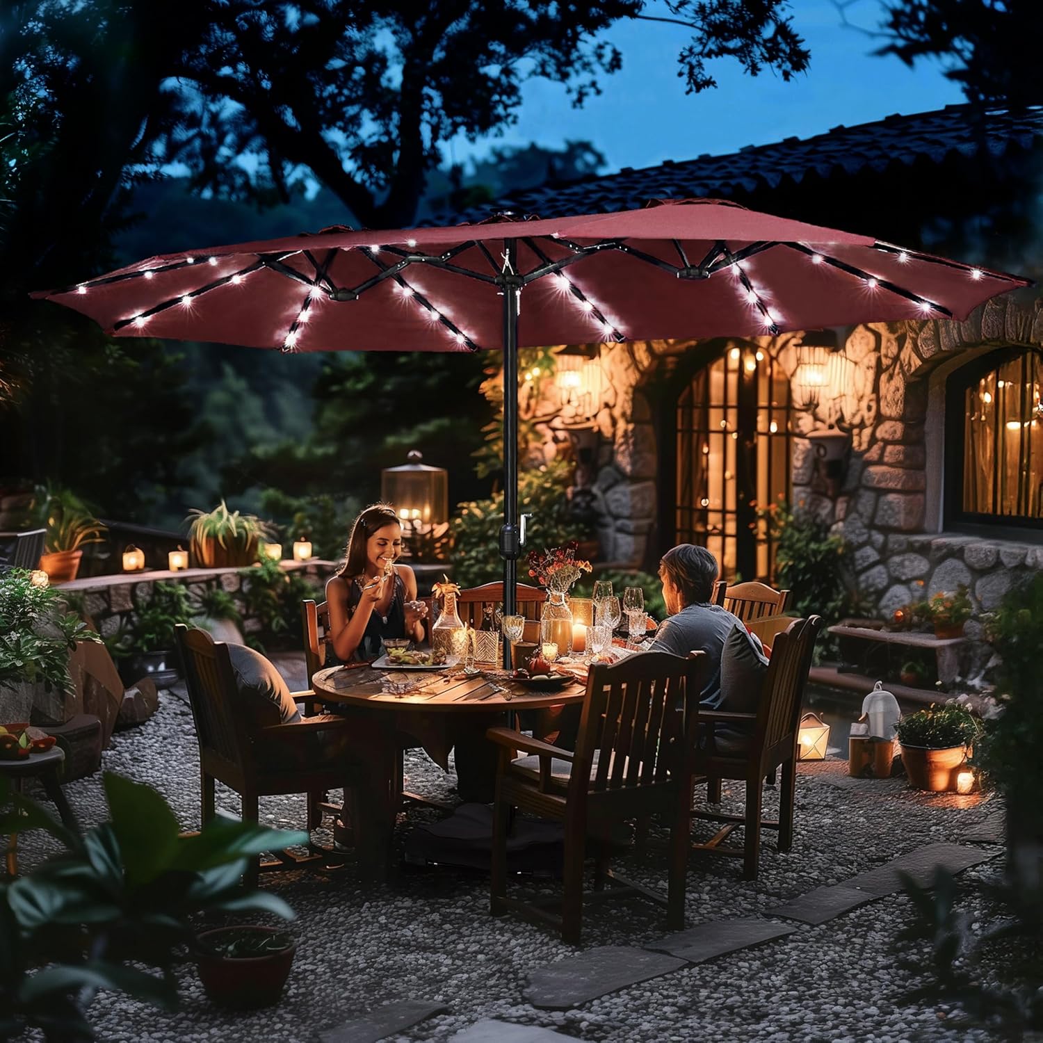 • 15 ft Large Patio Umbrella with Solar Lights Double-Sided Outdoor Rectangle Market Umbrellas with 36 LED Lights/Base Included/Easy Crank for Patio Garden Yard Pool Lawn, Brown