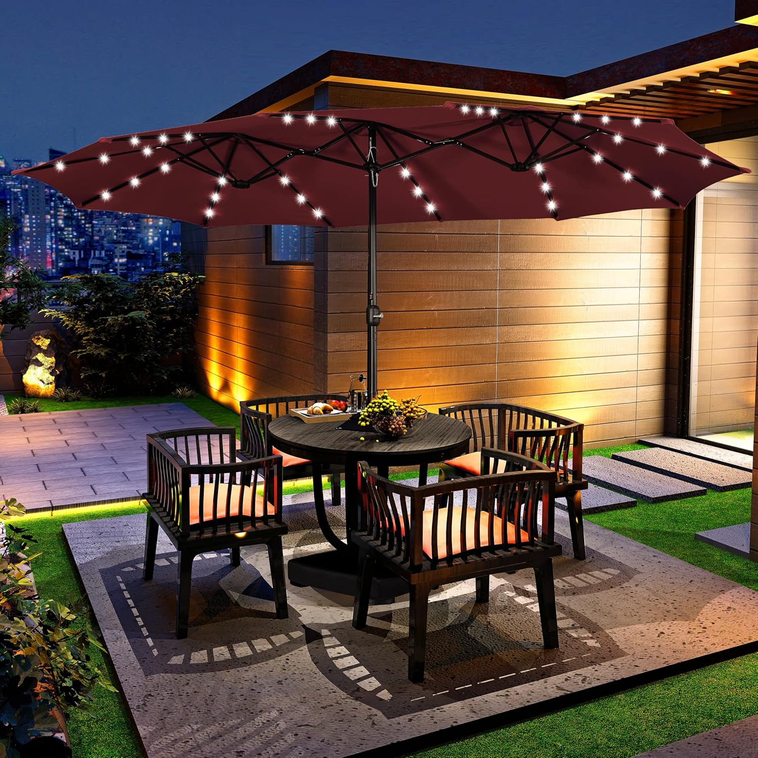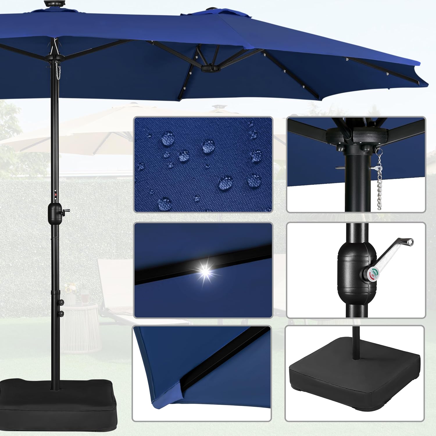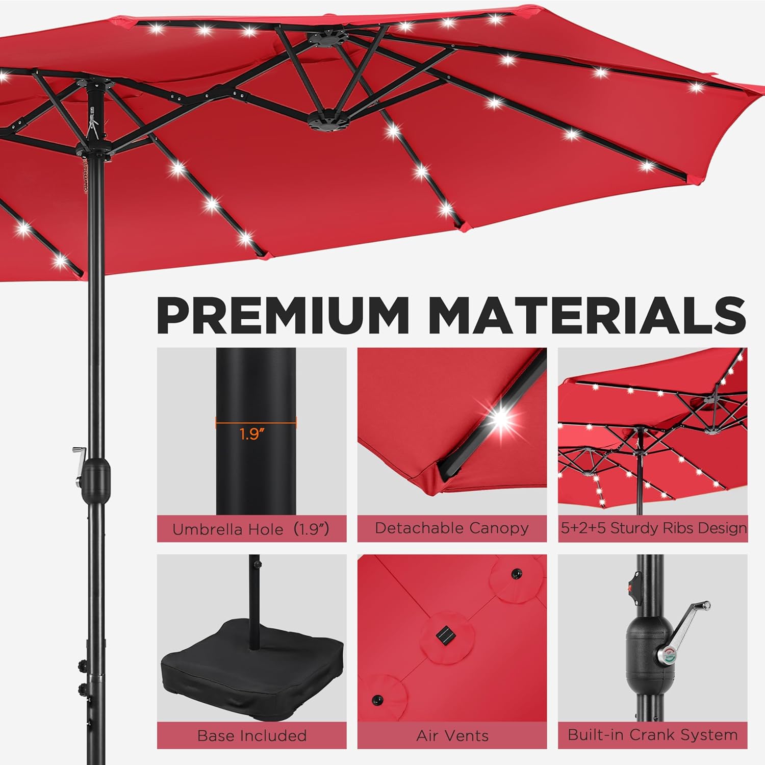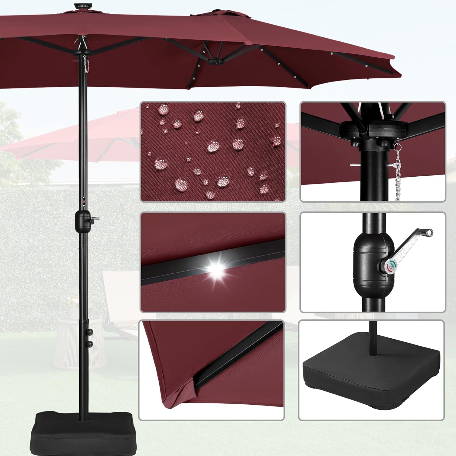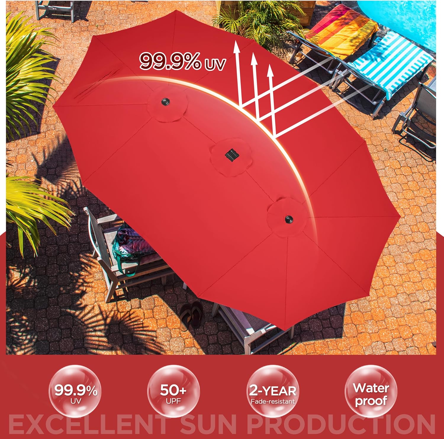 • 15 ft Large Patio Umbrella with Solar Lights Double-Sided Outdoor Rectangle Market Umbrellas with 36 LED Lights/Base Included/Easy Crank for Patio Garden Yard Pool Lawn, Brown