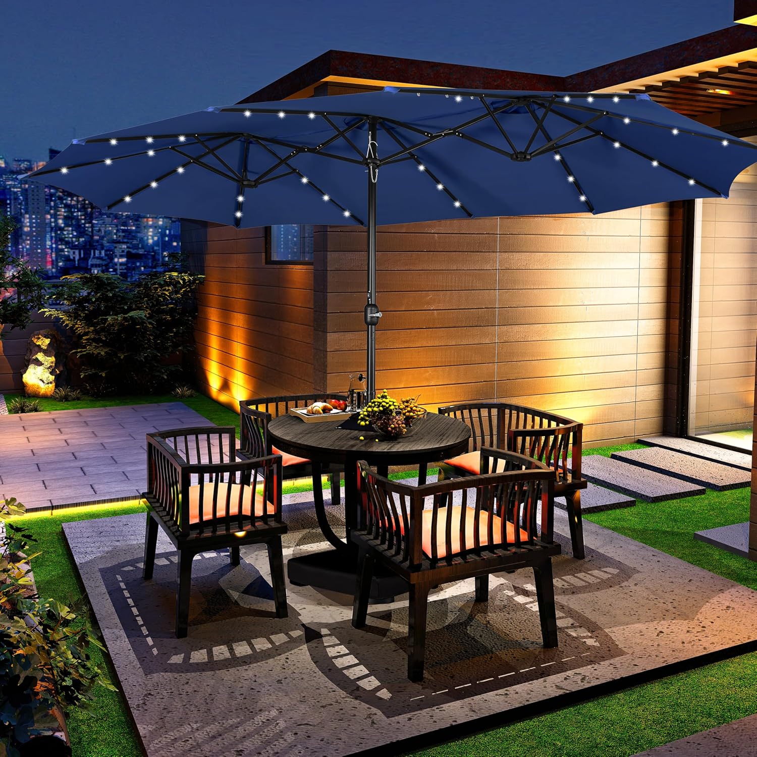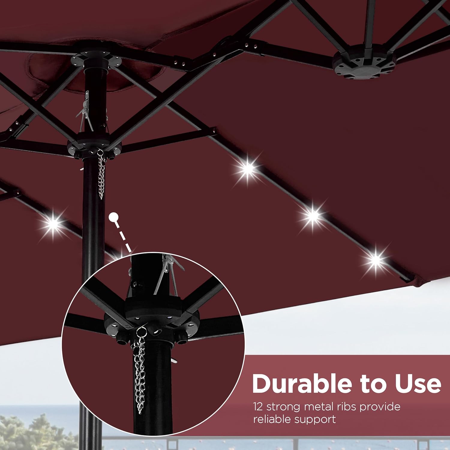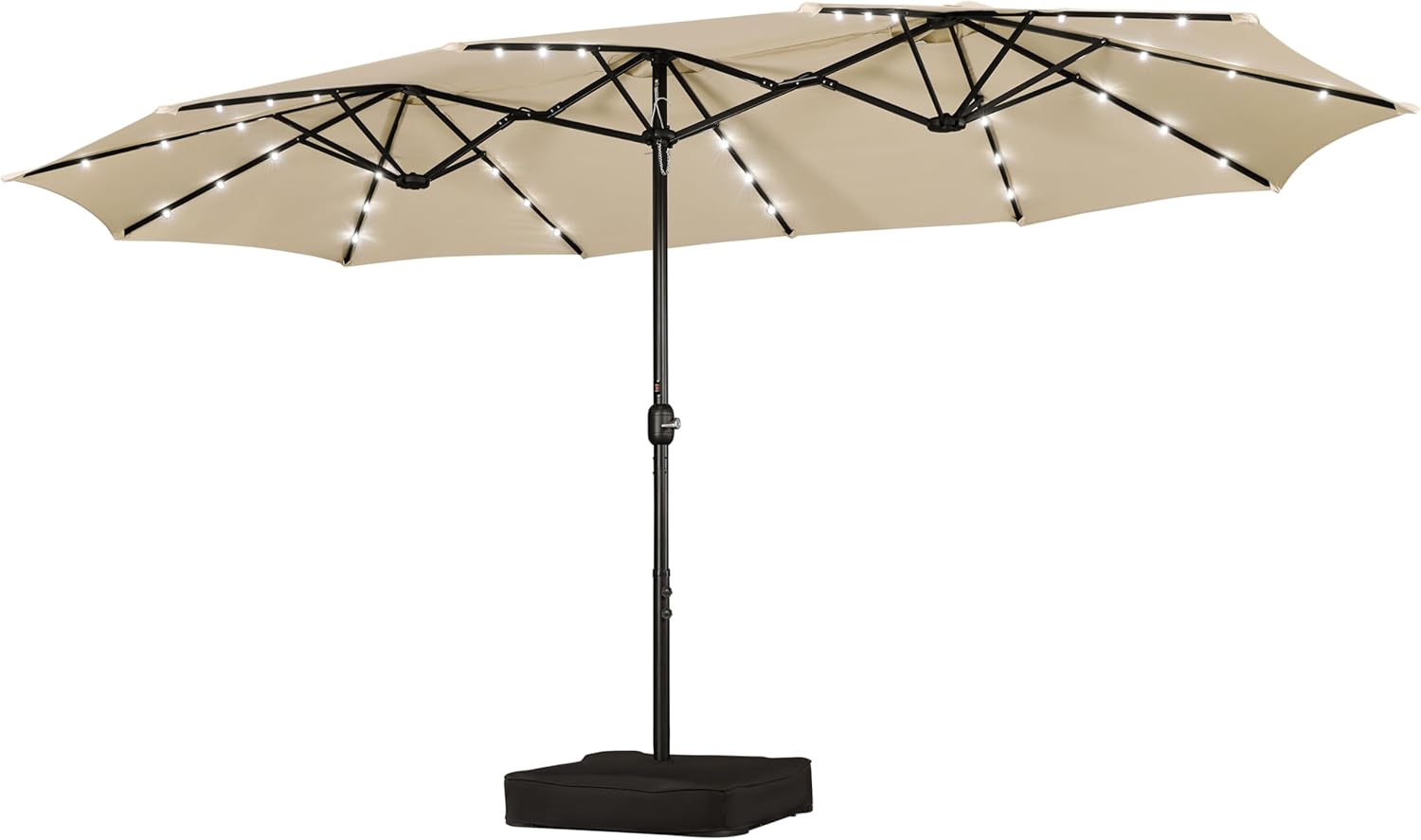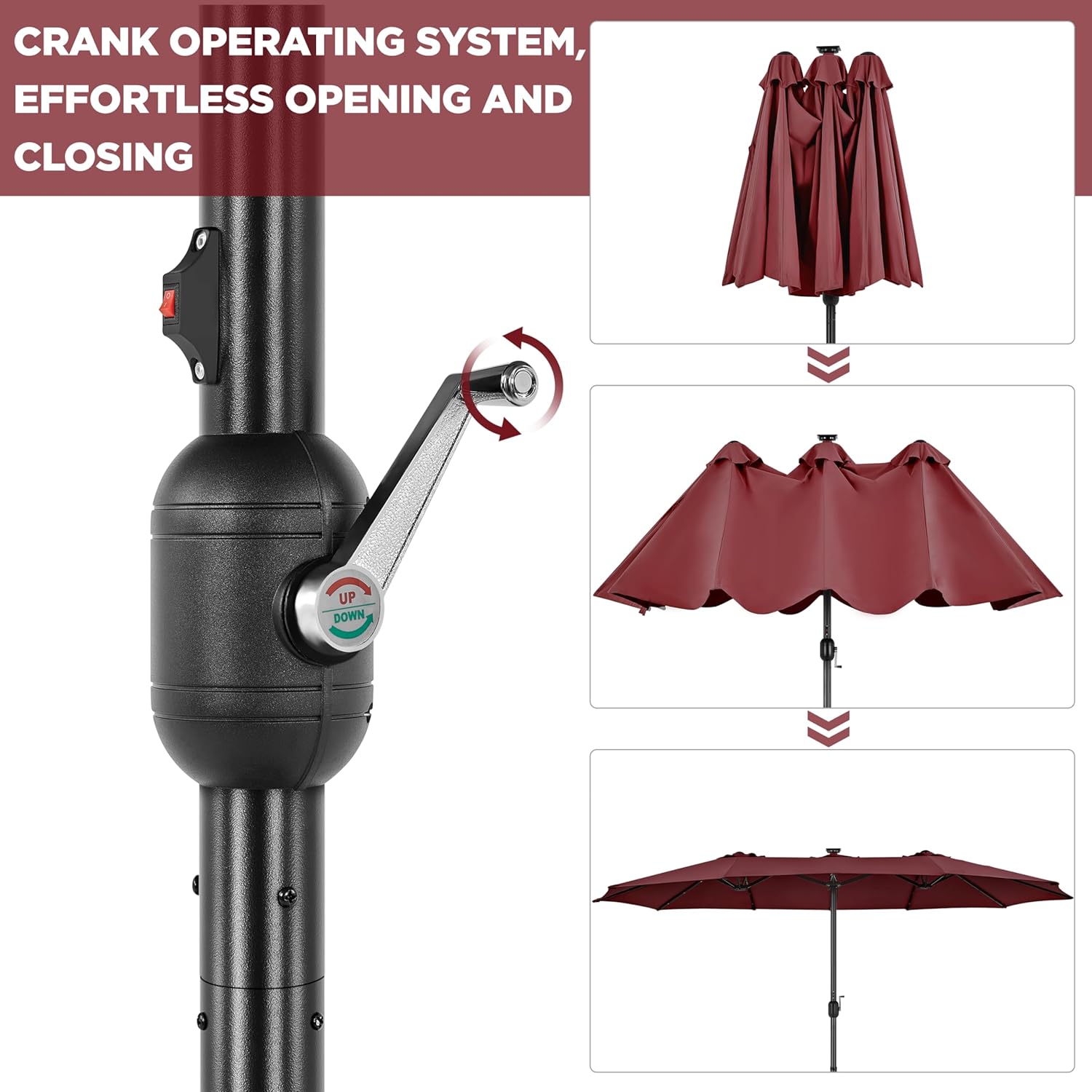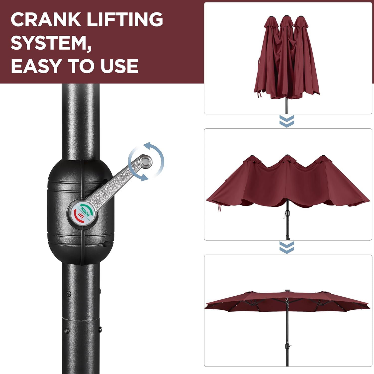 • 15 ft Large Patio Umbrella with Solar Lights Double-Sided Outdoor Rectangle Market Umbrellas with 36 LED Lights/Base Included/Easy Crank for Patio Garden Yard Pool Lawn, Brown