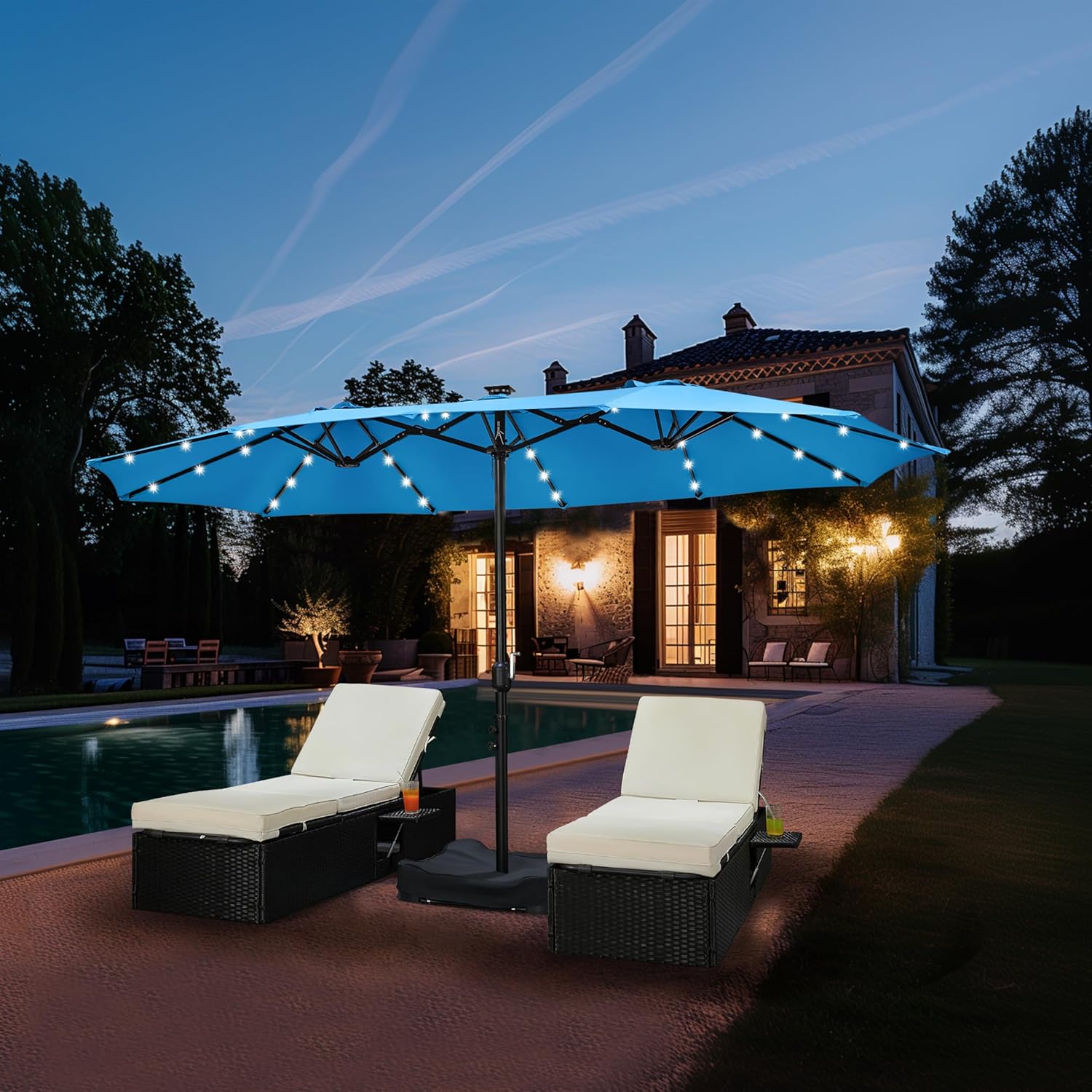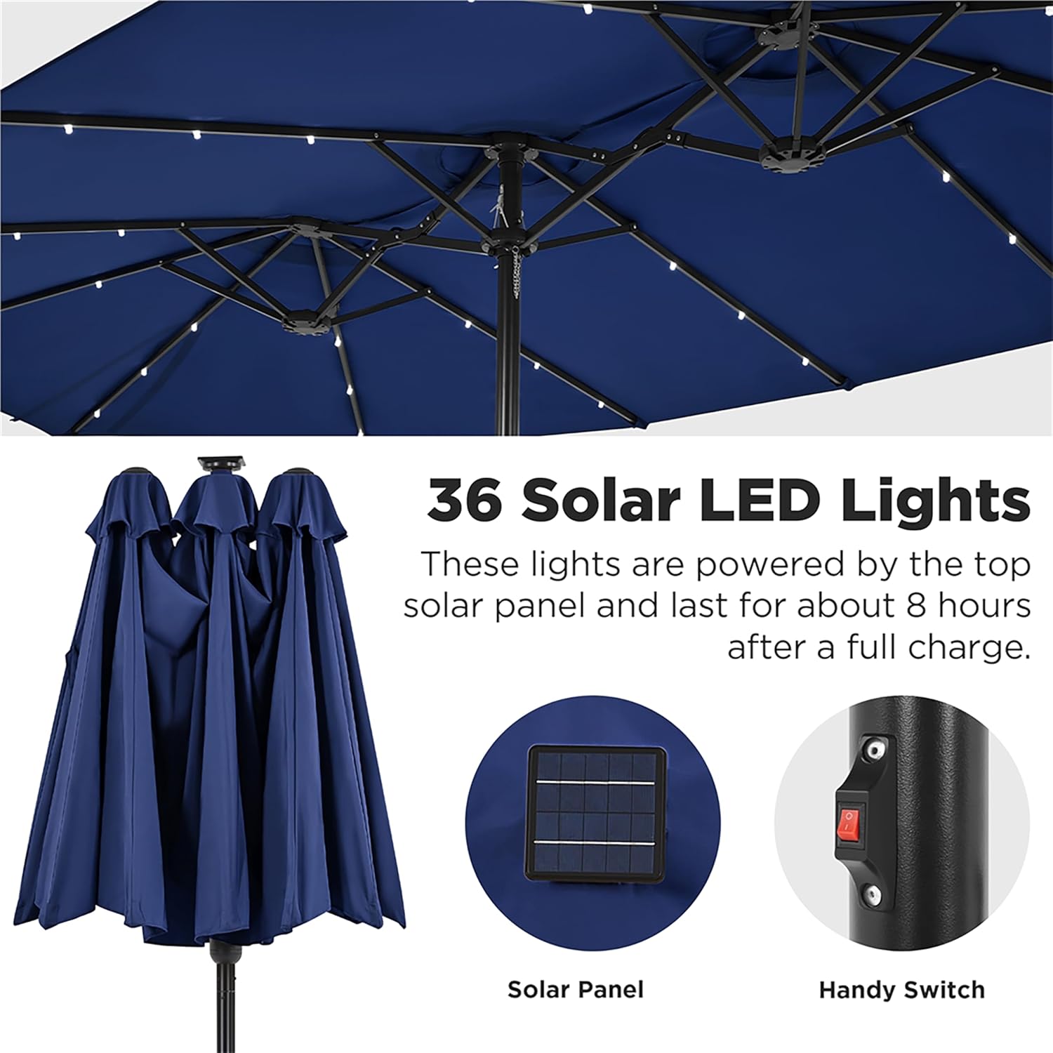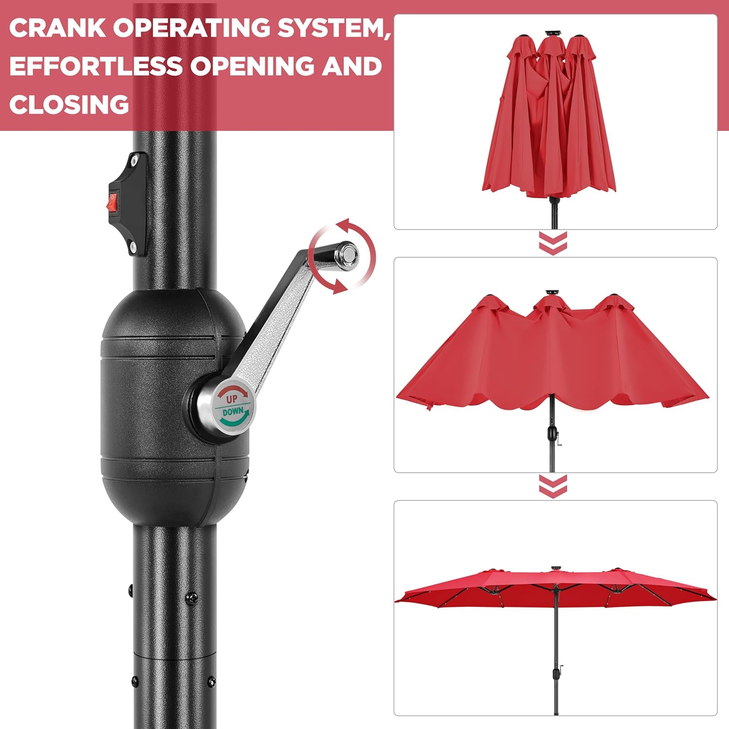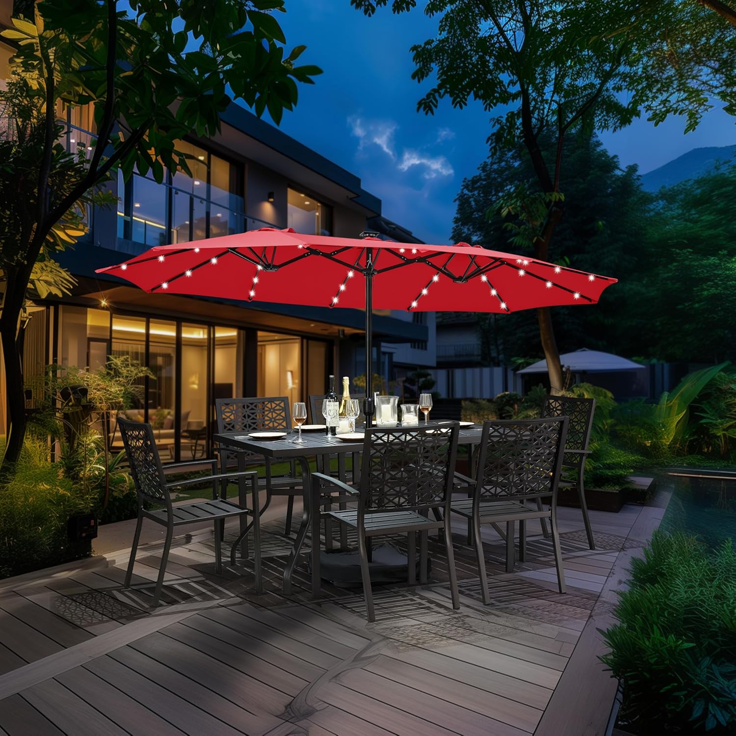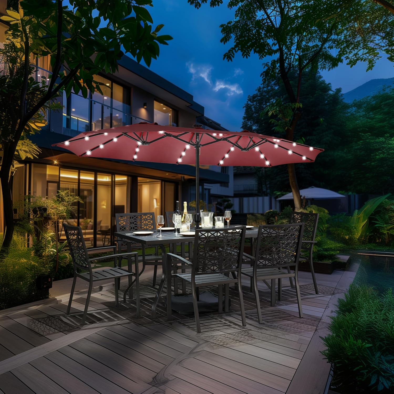 • 15 ft Large Patio Umbrella with Solar Lights Double-Sided Outdoor Rectangle Market Umbrellas with 36 LED Lights/Base Included/Easy Crank for Patio Garden Yard Pool Lawn, Brown