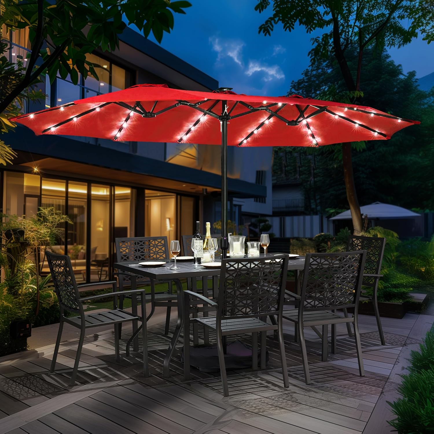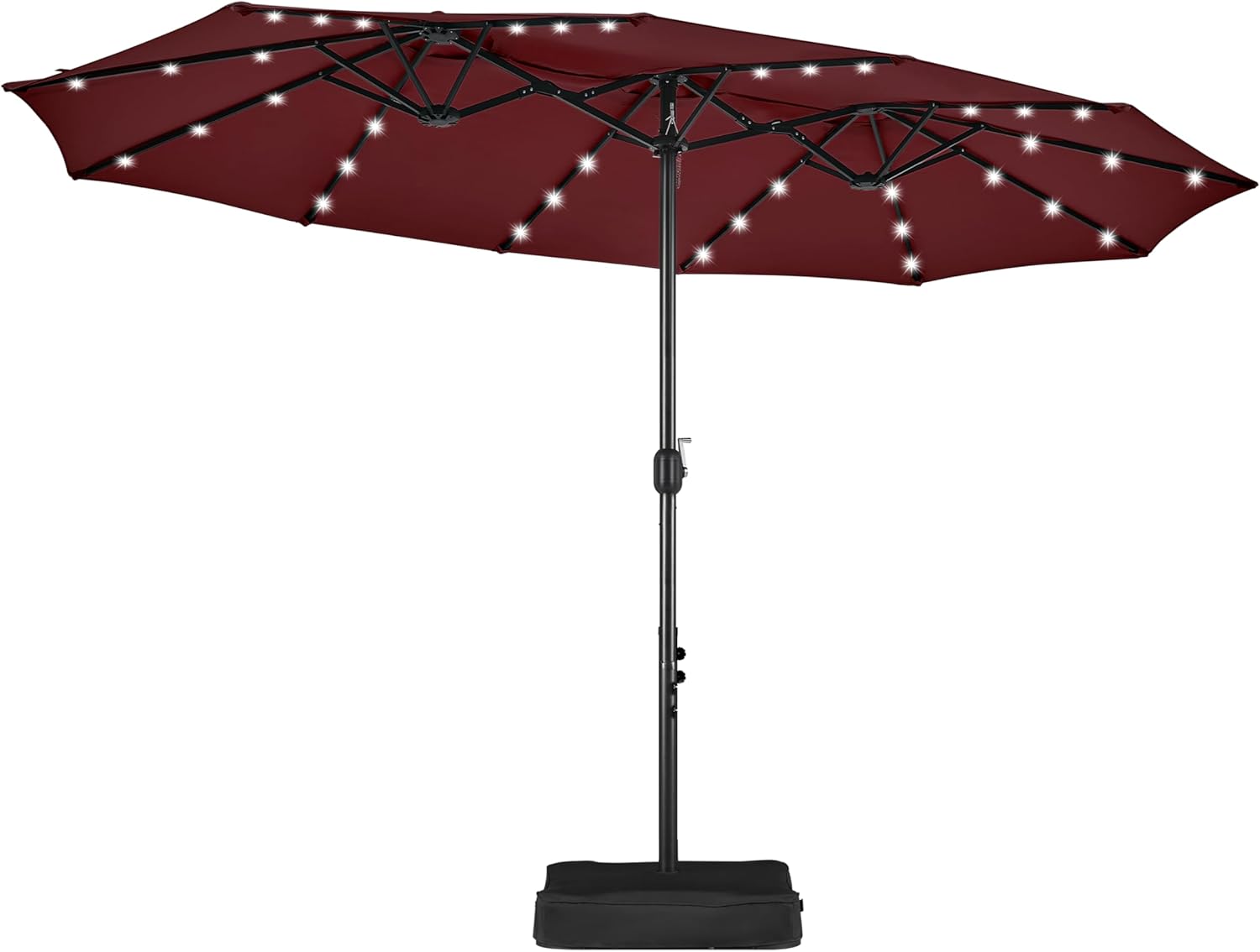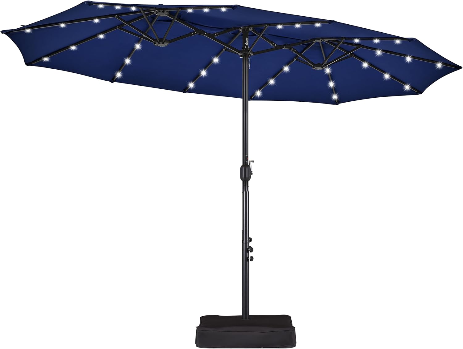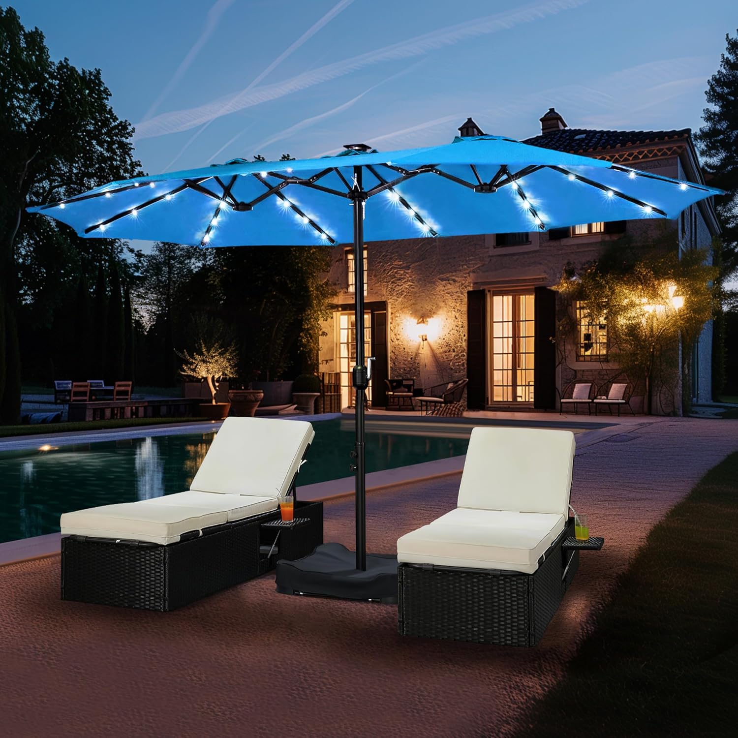 • 15 ft Large Patio Umbrella with Solar Lights Double-Sided Outdoor Rectangle Market Umbrellas with 36 LED Lights/Base Included/Easy Crank for Patio Garden Yard Pool Lawn, Brown