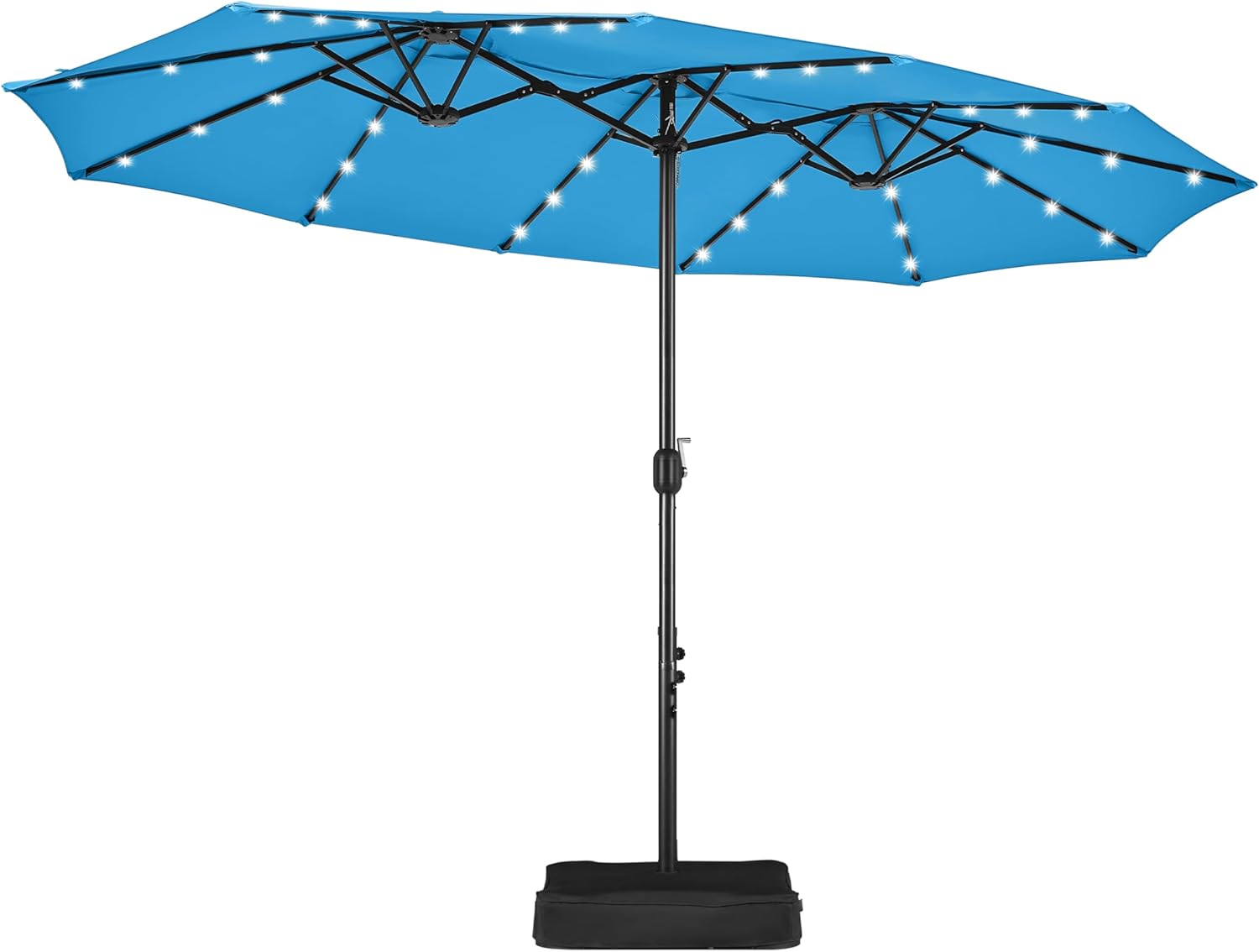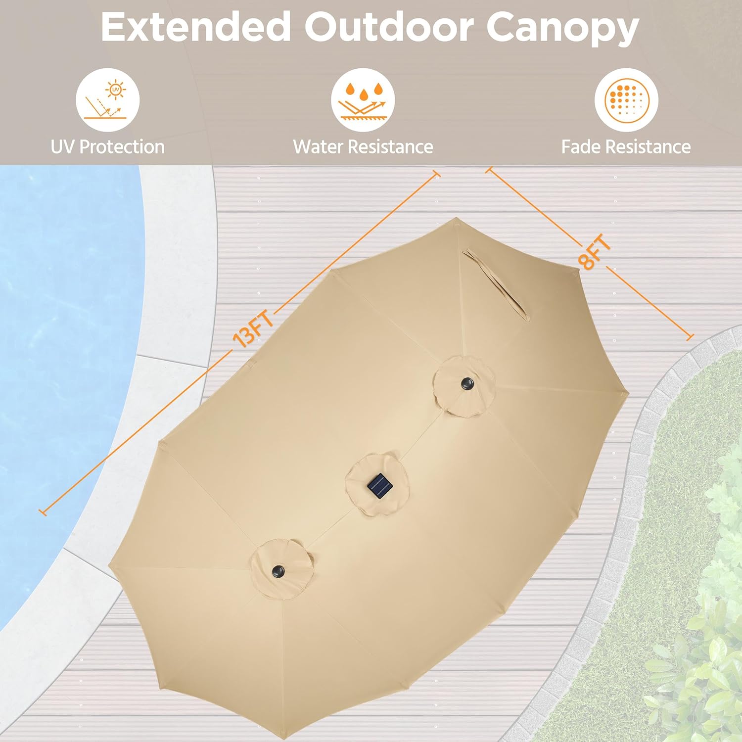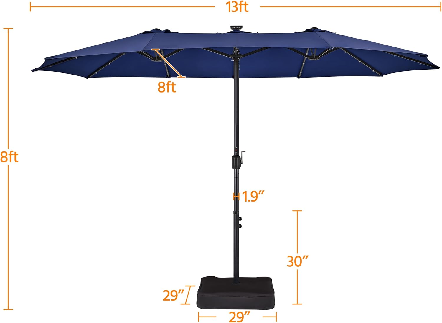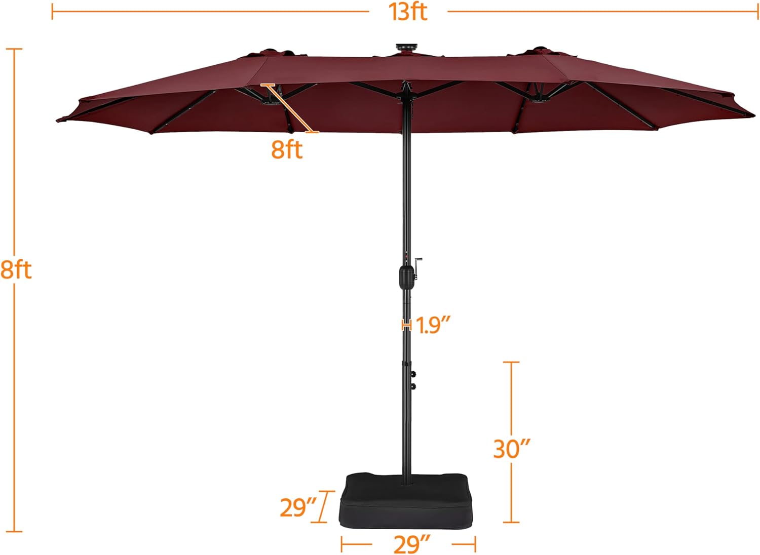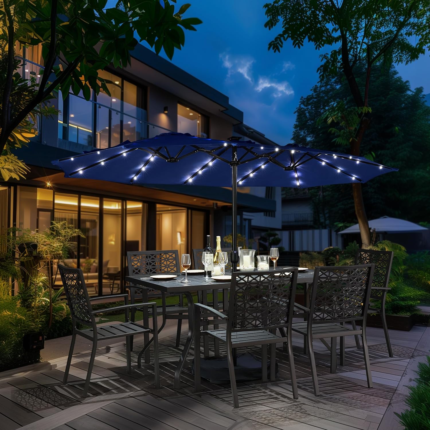 • 15 ft Large Patio Umbrella with Solar Lights Double-Sided Outdoor Rectangle Market Umbrellas with 36 LED Lights/Base Included/Easy Crank for Patio Garden Yard Pool Lawn, Brown