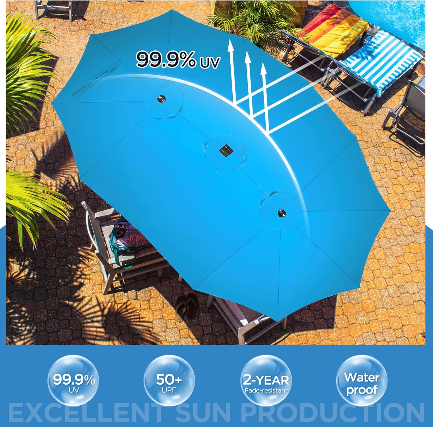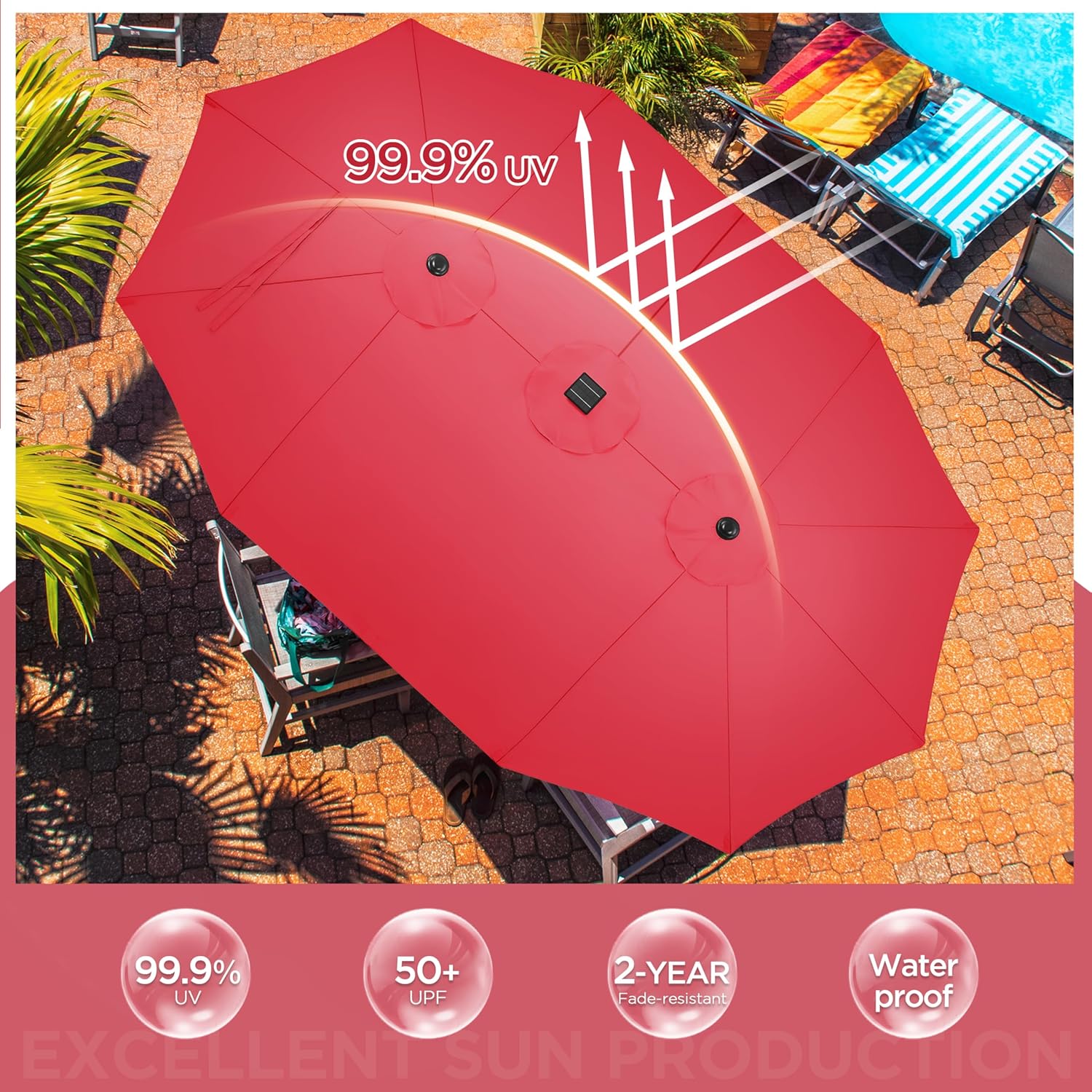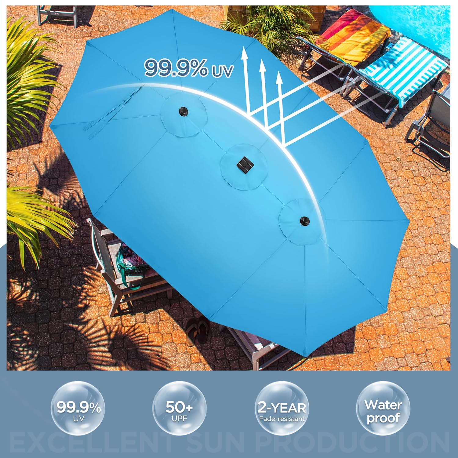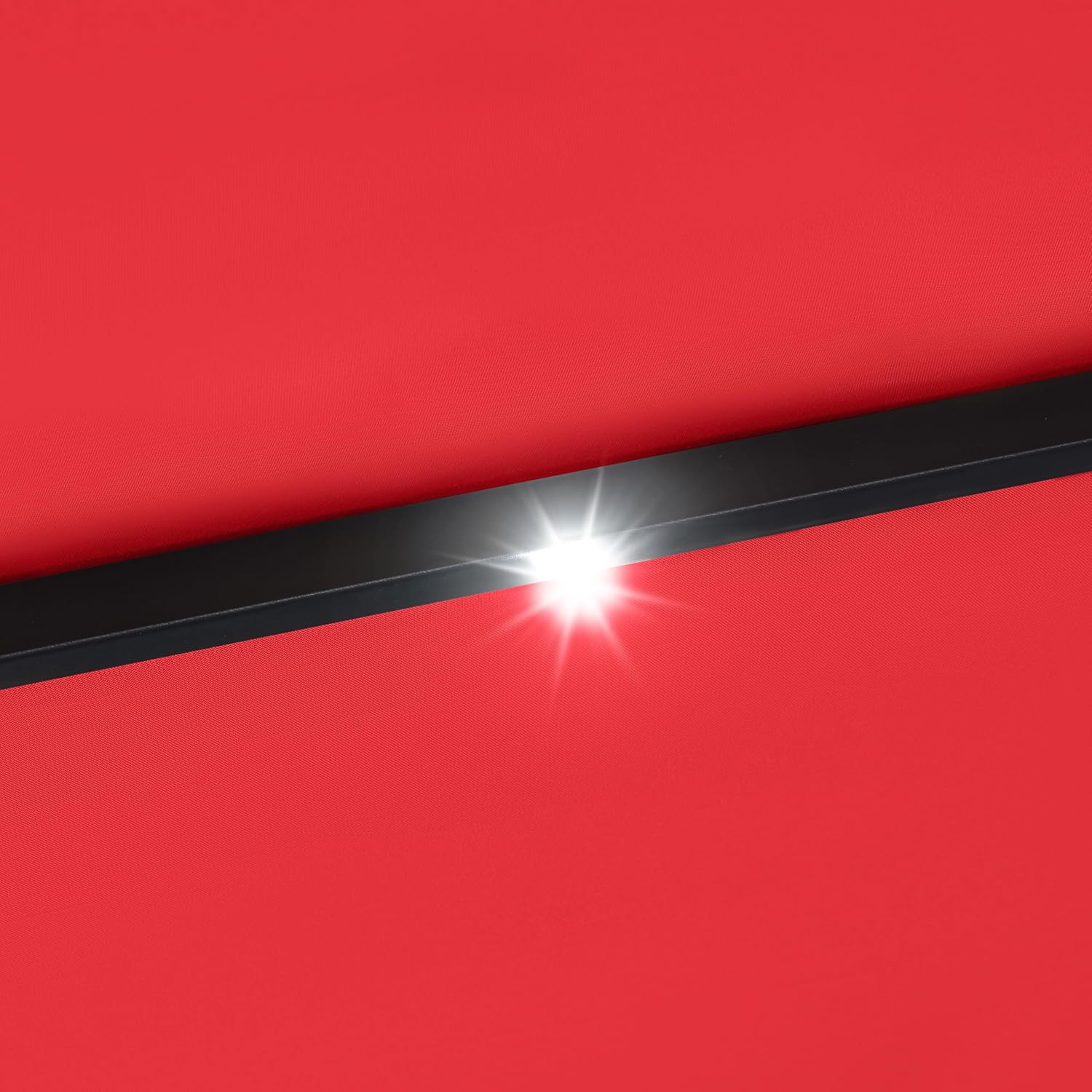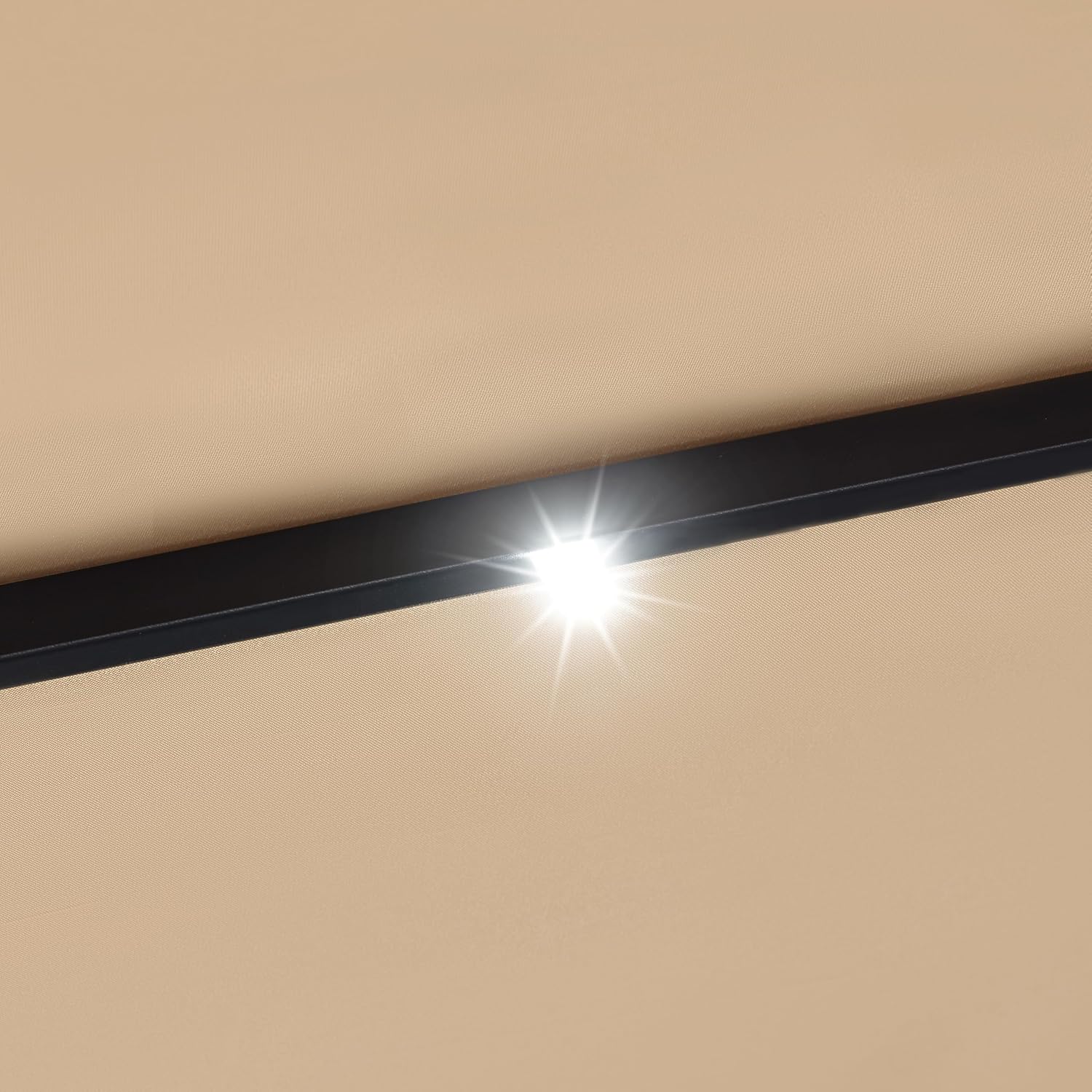 • 36 Solar-Powered LED Lights: This patio parasol embraces 36 solar-powered LED lights along the ribs. providing ambient lighting and creating a romantic atmosphere. Powered by a top solar panel and an AA rechargeable battery. the lights offer up to 8 hours of illumination after a full charge