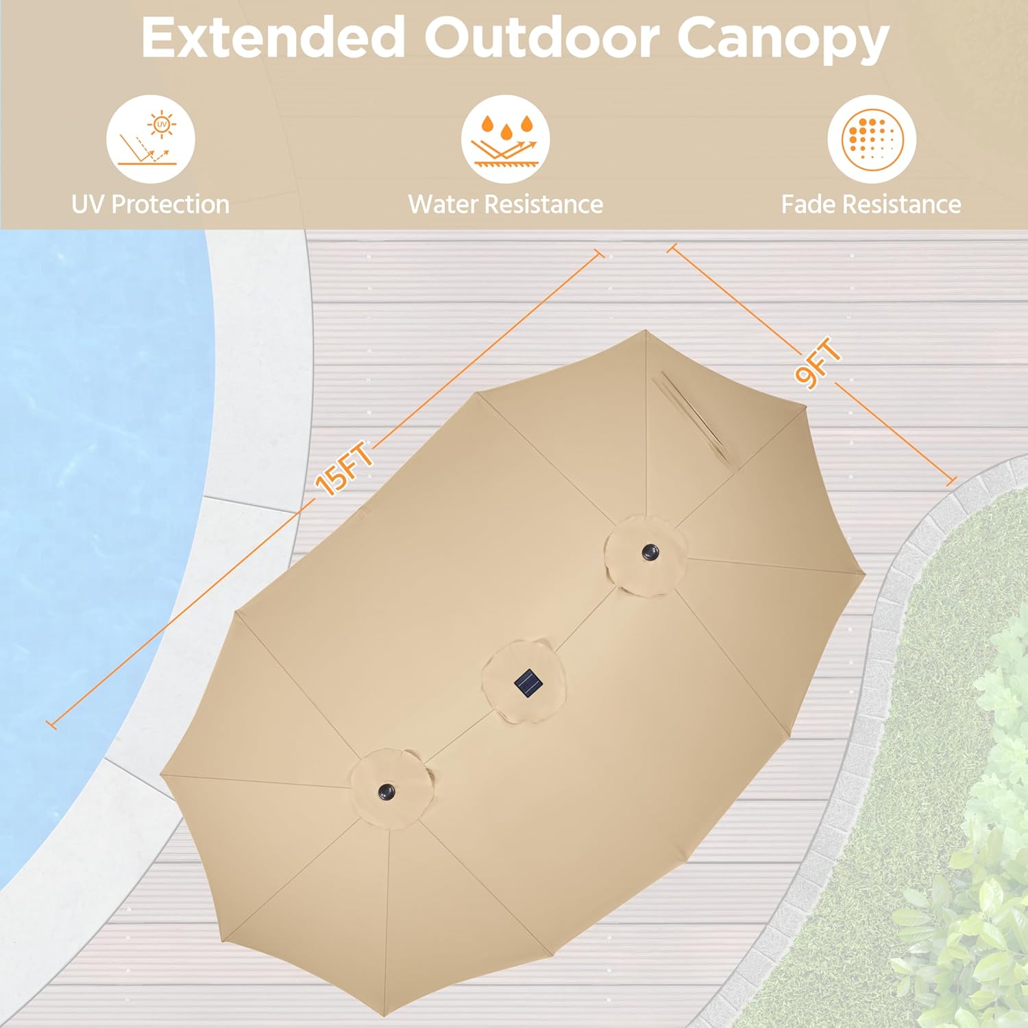 15 ft Large Patio Umbrella with Solar Lights Double-Sided Outdoor Rectangle Market Umbrellas with 36 LED Lights/Base Included/Easy Crank for Patio Garden Yard Pool Lawn, Brown